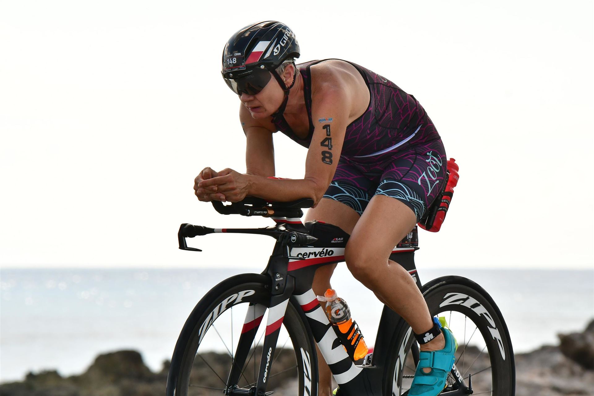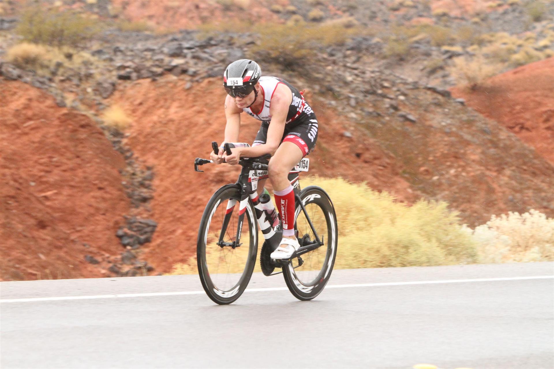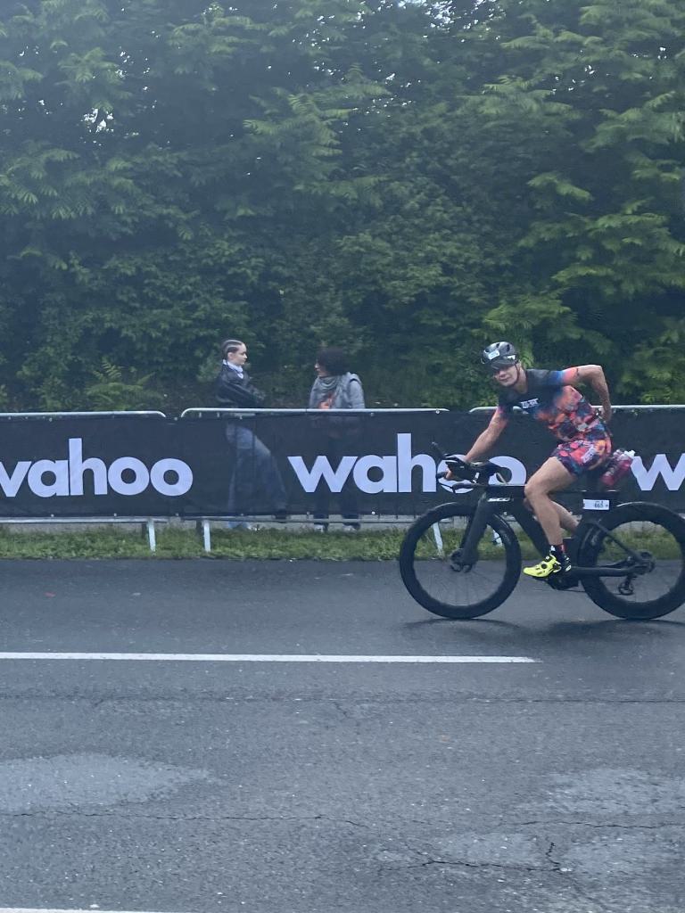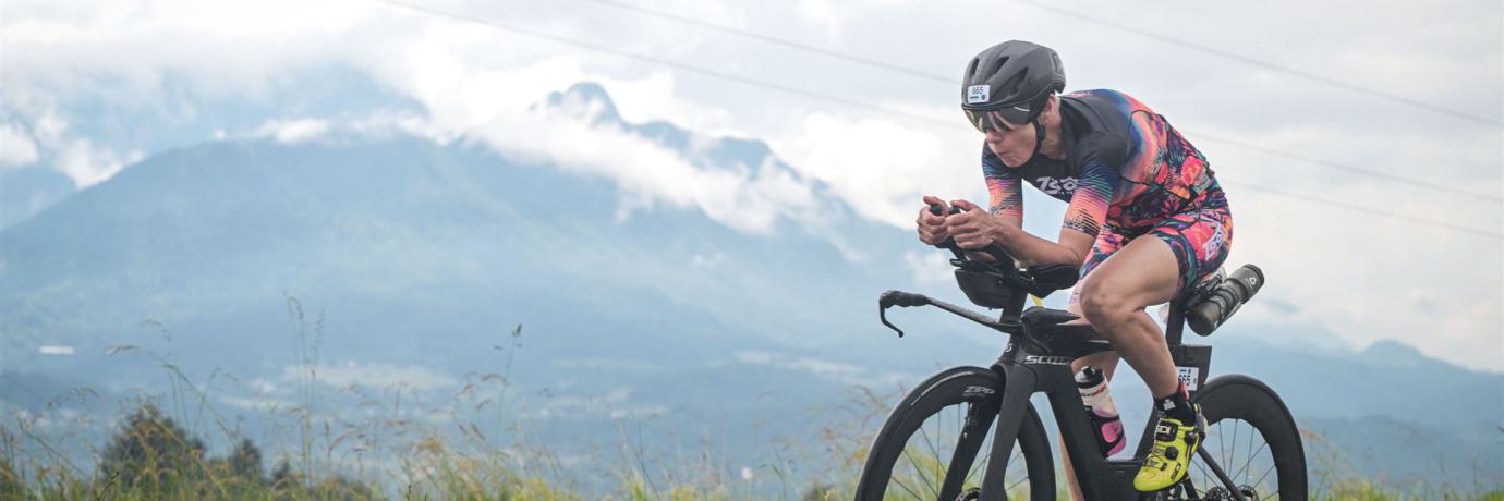 Aufgrund der für meine Verhältnisse niedrigen Temperaturen ziehe ich Socken mit klassischen Rennradschuhen sowie ein Trikot über. Das war die beste Entscheidung. Das erste Stück der Radstrecke führt am Wörthersee entlang. Die Straßen sind noch nass vom Regen, dafür ist die Aussicht traumhaft. Es lässt sich relativ gut fahren, durch den Rolling-Start ist das Feld nicht so dicht. Selbstverständlich muss man schauen, dass man keinen Windschatten fährt, es klappt aber ganz gut. Der erste längere Anstieg ist der Faaker See. Aufgrund der Wetterverhältnisse sind nicht viele Zuschauer am Anstieg. Ich kurble den Anstieg im kleinen Gang hoch, ist kein Problem für mich. Danach kommt ein flaches Stück, da gibt es immer relativ viel Gegenwind. Ich fühle mich sehr gut auf dem Rad, habe Druck auf den Pedalen und kann den Wettkampf genießen. Die Wettervorhersage passt leider nicht ganz zum tatsächlichen Wetter. Es gibt Strecken mit Starkregen, die Straßen sind sehr nass, bei den Abfahrten muss man aufpassen. Den zweiten längeren Anstieg (Ruperti Berg) fahre ich auch ohne Probleme, bei den Abfahrten muss man aufpassen. Der 180 Kilometerkurs besteht aus 2 Runden. Die Anstiege müssen zweimal gefahren werden. Auf der zweiten Runde sind die Steigungen dann doch etwas schwerer. Insgesamt bin ich mit meiner Radzeit von 6:01:37 Stunden sehr zu frieden.