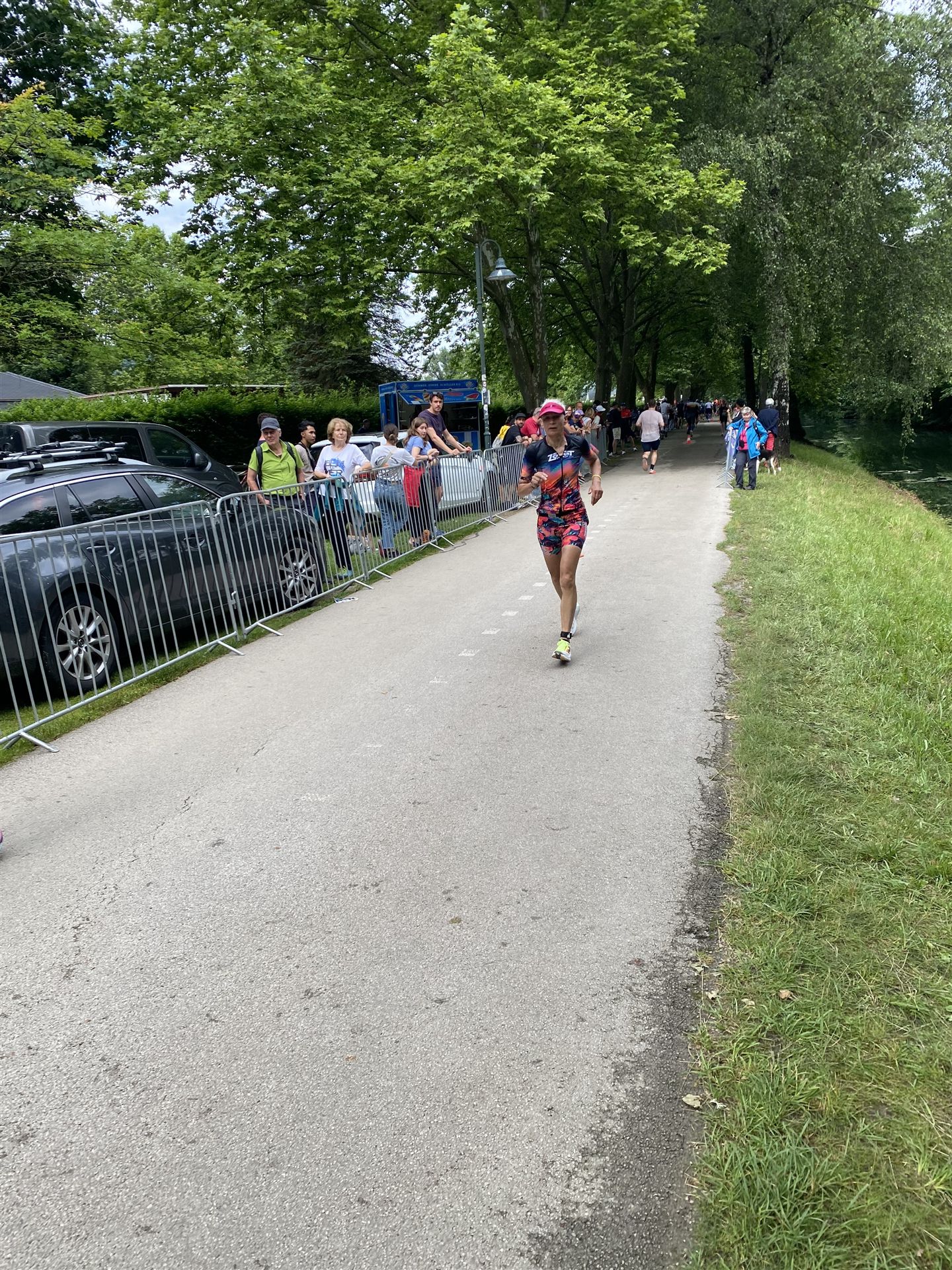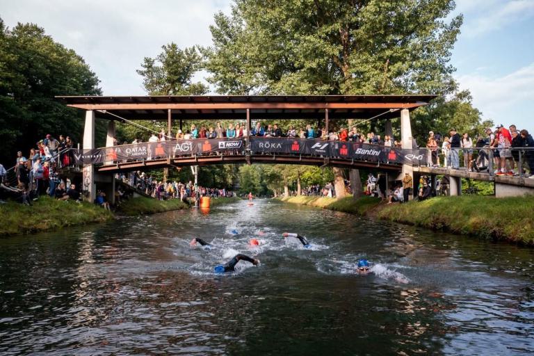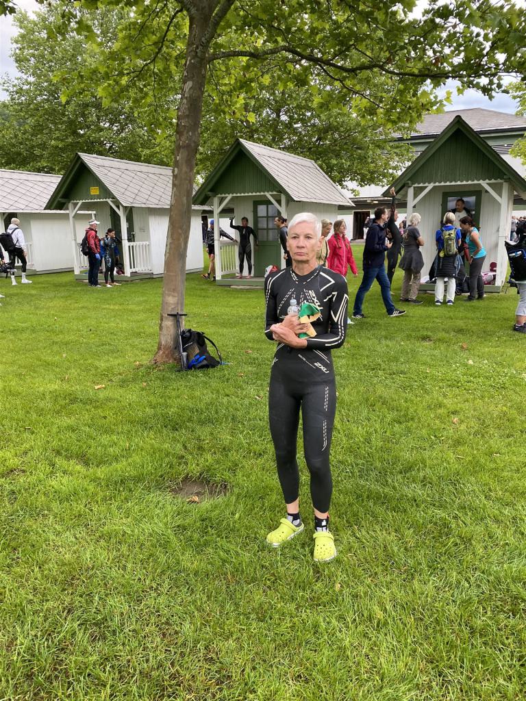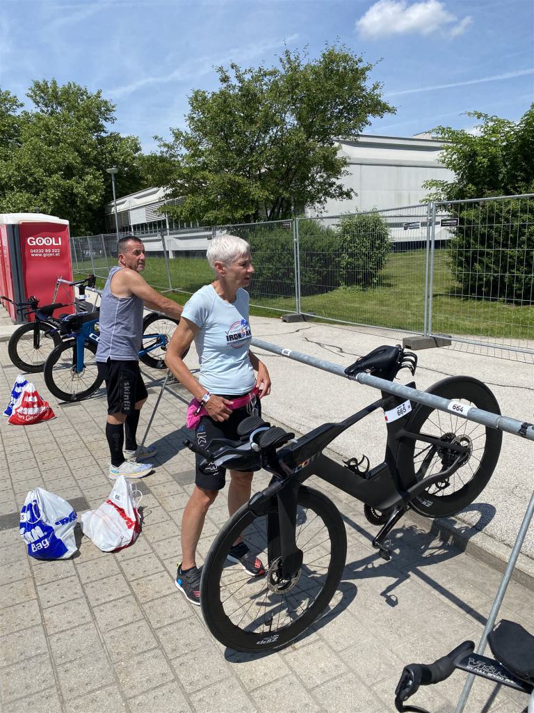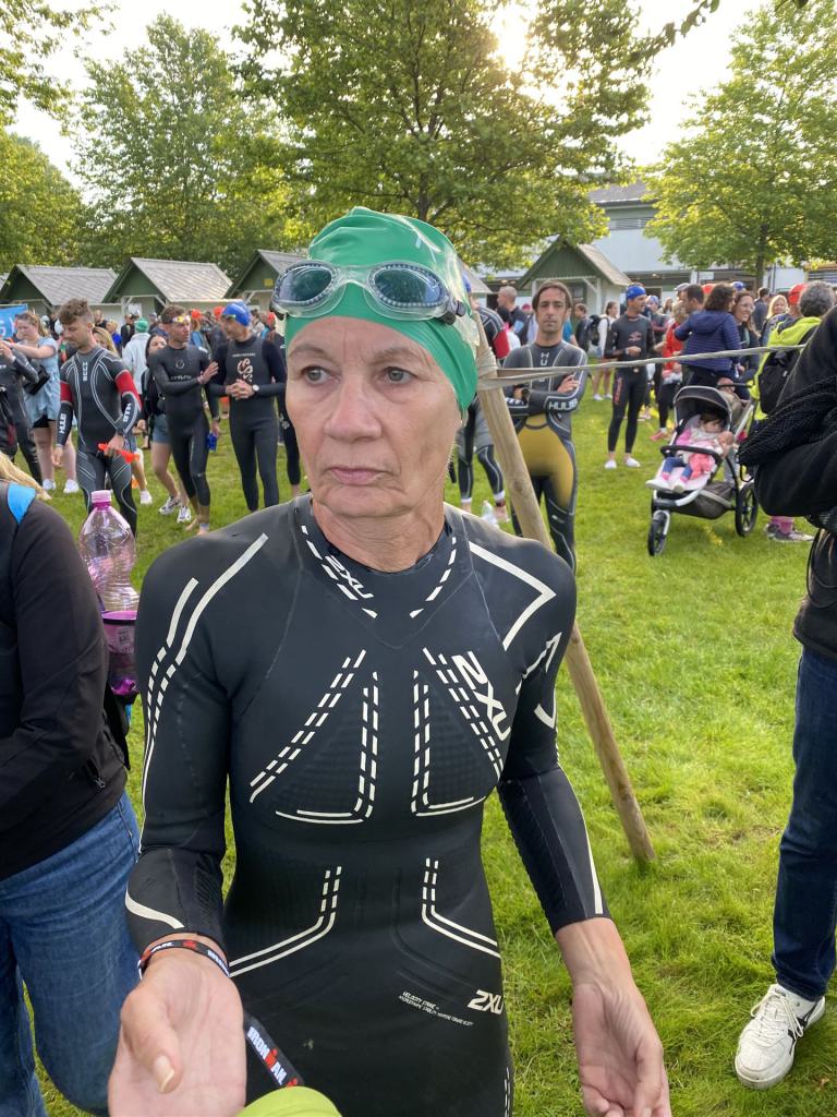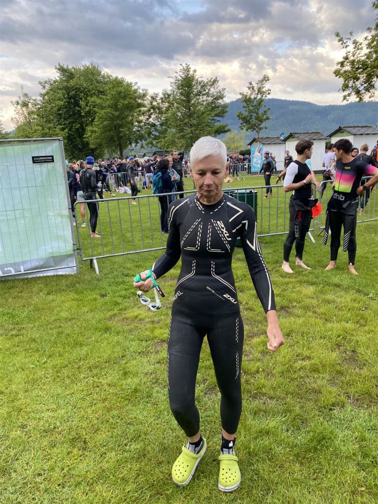 Geschwommen werden die 3,8 Kilometer im Wörthersee. Der See hat Trinkwasserqualität und ist relativ klar. Gestartet wird in Gruppen, man ordnet sich entsprechend der voraussichtlichen Schwimmzeit in eine Gruppe ein. Die Profimänner starteten um 6:30 Uhr, es gab keine Profifrauen. Ab 6:40 Uhr gingen die Agegrouper ins Wasser. Da ich keine Uhr beim Wettkampf trage konnte ich nicht einschätzen, wie lange es gedauert hat, bis ich ins Wasser konnte. Alle 5 Sekunden gingen 4 Athleten ins Wasser. Das Schwimmen war relativ entspannt, ich wurde nicht oft überholt und habe auch wenige Athleten überholt. Ich denke, die meisten Athleten haben sich korrekt eingeordnet. Der erste Streckenabschnitt klappt super, ich kann die Bojen sehr gut erkennen. Beim Rückweg in Richtung Lendkanal hatte ich leichte Schwierigkeiten mit den Bojen. War aber nicht schlimm für mich, ich habe mich an den anderen Athleten orientiert. Den Eingang zum Lendkanal konnte ich nicht erkennen, ohne Brille und dann noch direkt die Sonne, da habe mich absolut auf die anderen verlassen. Erstaunlicherweise hielt sich das Gedränge im Lendkanal auch in Grenzen, ich hatte mich Mental auf dichtes Gedränge und evtl. auch Schläge eingestellt. Nichts davon ist passiert. Das Schöne an diesem Kanal sind die Zuschauer auf beiden Seiten, die Stimmung ist super. Der Schwimmausstieg ist am Parkhotel, die Strecke bis in die Wechselzone ist relativ lang. Ich komme als 2. Frau in meiner AK aus dem Wasser. Mit meiner Schwimmzeit von 1:19:50 bin ich zufrieden.