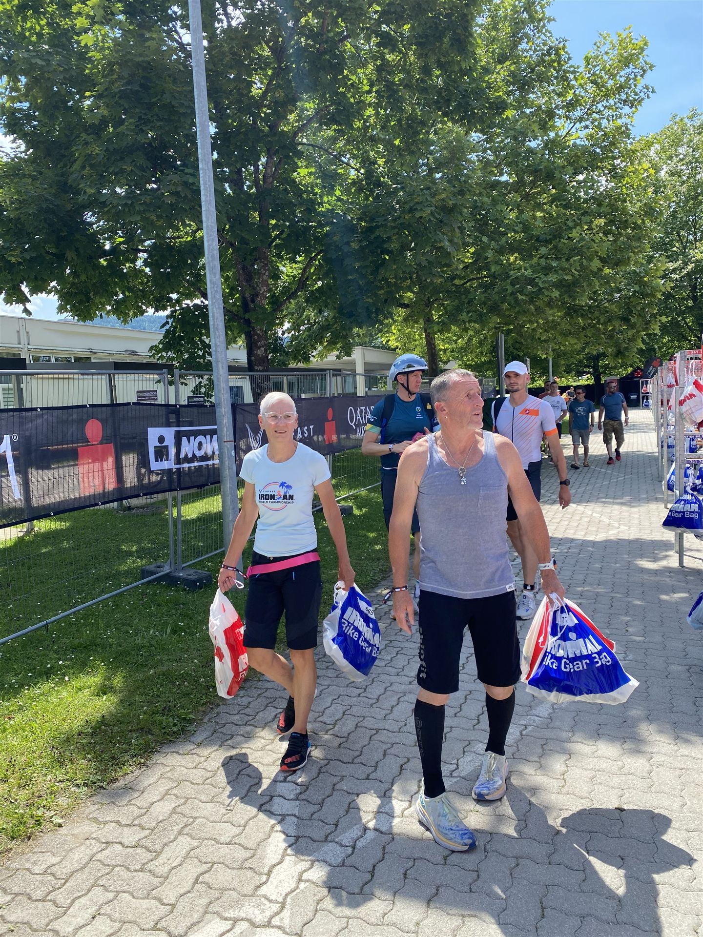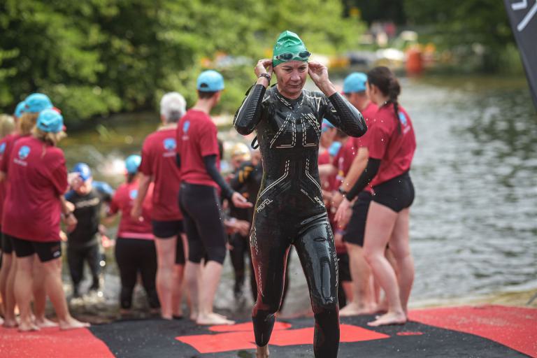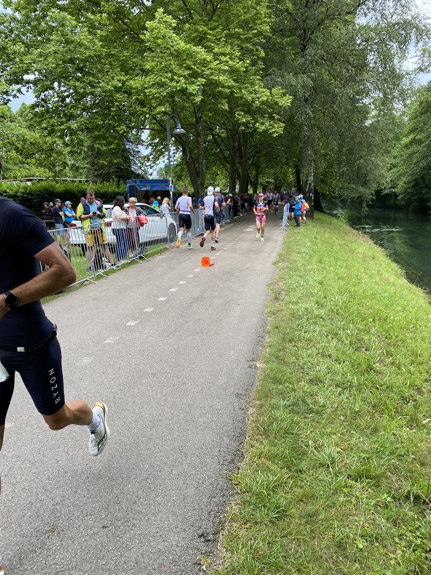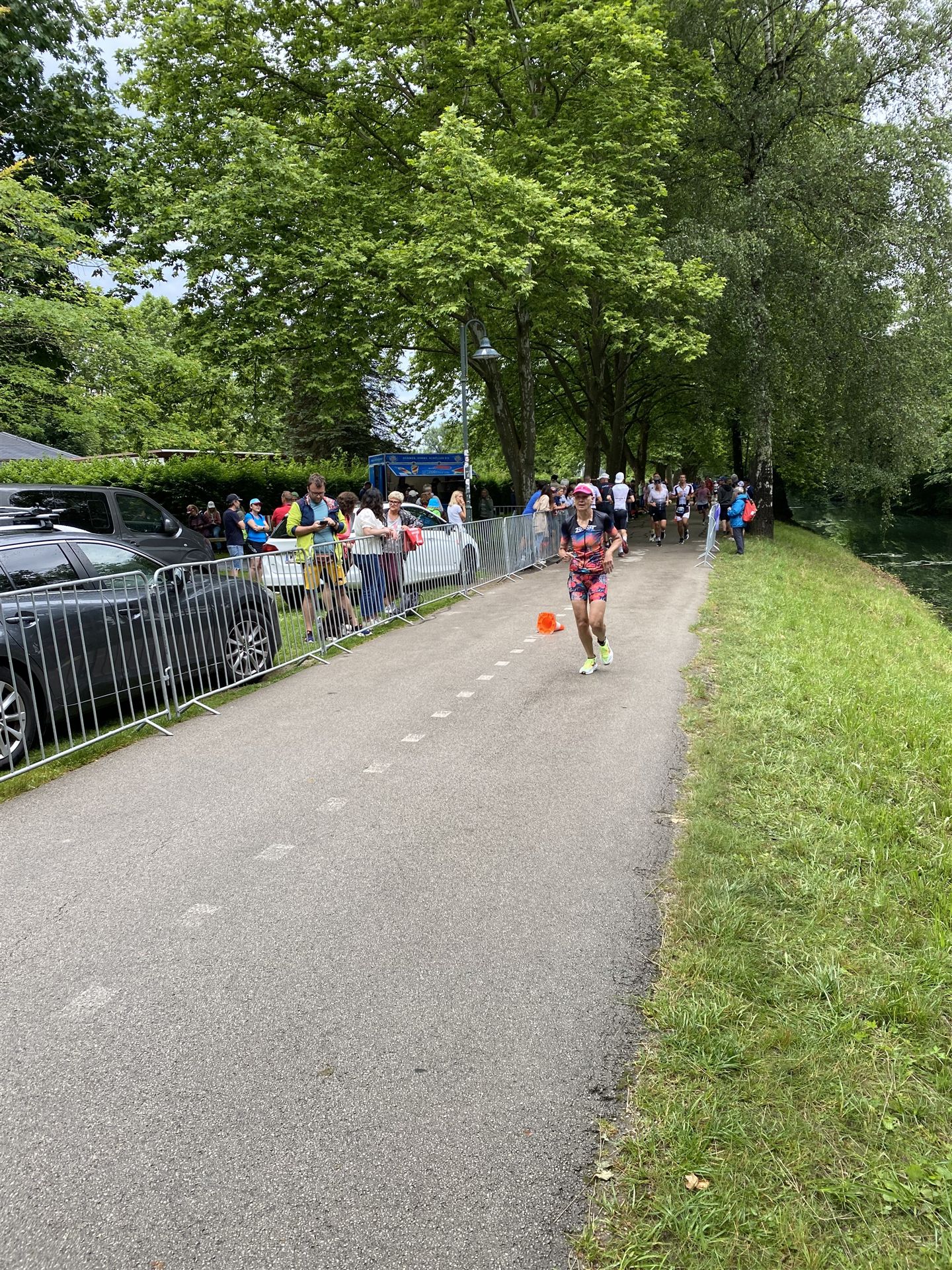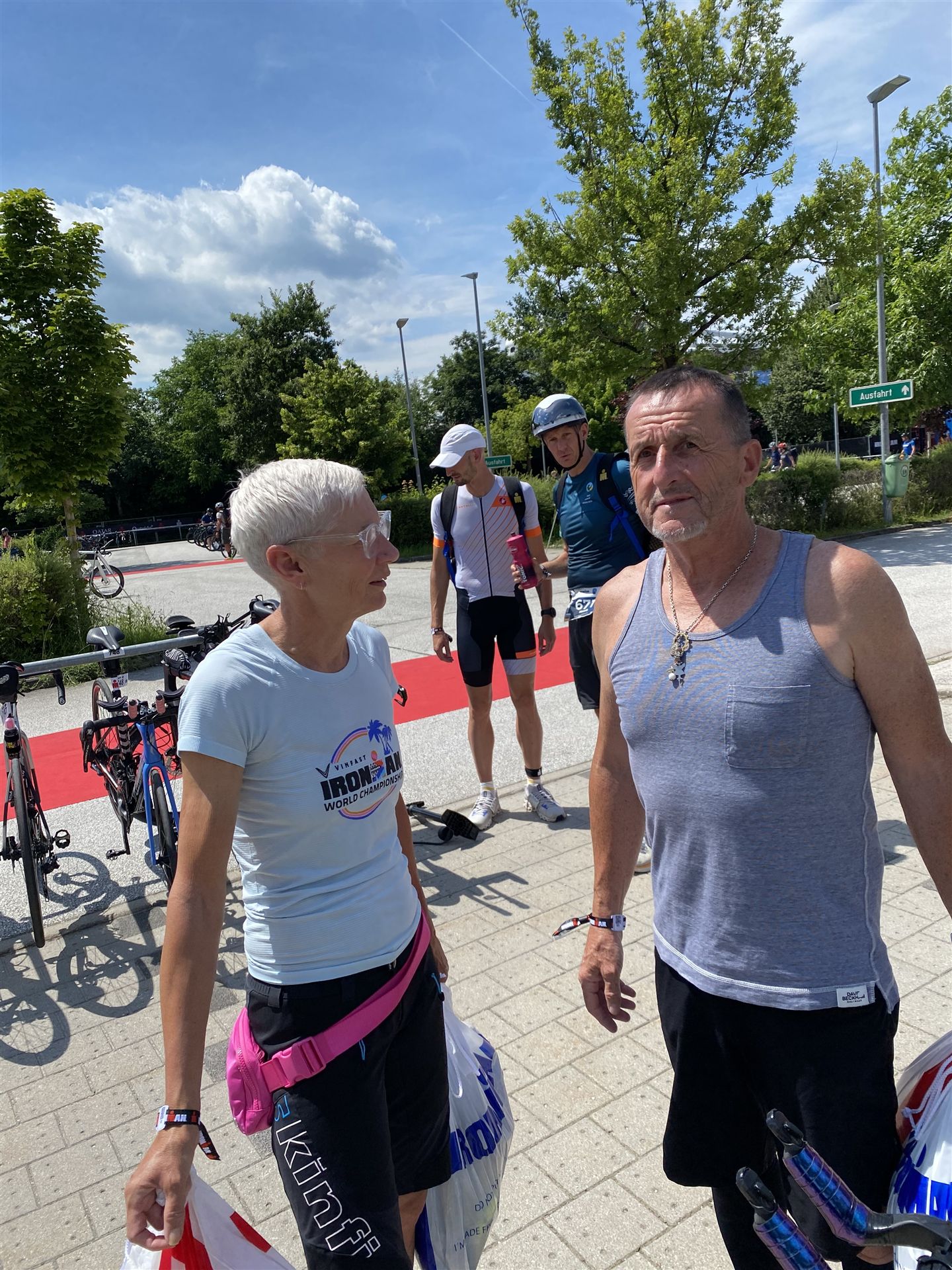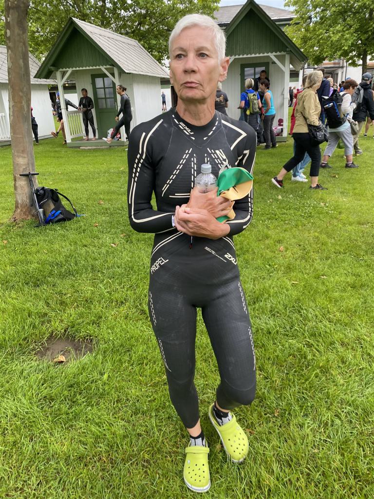 Geschwommen werden die 3,8 Kilometer im Wörthersee. Der See hat Trinkwasserqualität und ist relativ klar. Gestartet wird in Gruppen, man ordnet sich entsprechend der voraussichtlichen Schwimmzeit in eine Gruppe ein. Die Profimänner starteten um 6:30 Uhr, es gab keine Profifrauen. Ab 6:40 Uhr gingen die Agegrouper ins Wasser. Da ich keine Uhr beim Wettkampf trage konnte ich nicht einschätzen, wie lange es gedauert hat, bis ich ins Wasser konnte. Alle 5 Sekunden gingen 4 Athleten ins Wasser. Das Schwimmen war relativ entspannt, ich wurde nicht oft überholt und habe auch wenige Athleten überholt. Ich denke, die meisten Athleten haben sich korrekt eingeordnet. Der erste Streckenabschnitt klappt super, ich kann die Bojen sehr gut erkennen. Beim Rückweg in Richtung Lendkanal hatte ich leichte Schwierigkeiten mit den Bojen. War aber nicht schlimm für mich, ich habe mich an den anderen Athleten orientiert. Den Eingang zum Lendkanal konnte ich nicht erkennen, ohne Brille und dann noch direkt die Sonne, da habe mich absolut auf die anderen verlassen. Erstaunlicherweise hielt sich das Gedränge im Lendkanal auch in Grenzen, ich hatte mich Mental auf dichtes Gedränge und evtl. auch Schläge eingestellt. Nichts davon ist passiert. Das Schöne an diesem Kanal sind die Zuschauer auf beiden Seiten, die Stimmung ist super. Der Schwimmausstieg ist am Parkhotel, die Strecke bis in die Wechselzone ist relativ lang. Ich komme als 2. Frau in meiner AK aus dem Wasser. Mit meiner Schwimmzeit von 1:19:50 bin ich zufrieden.