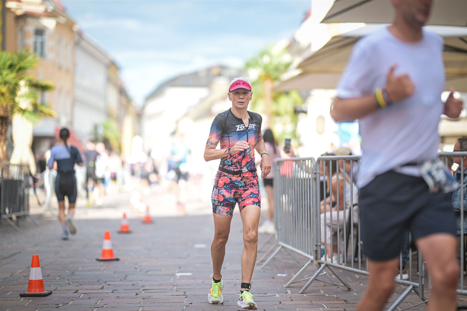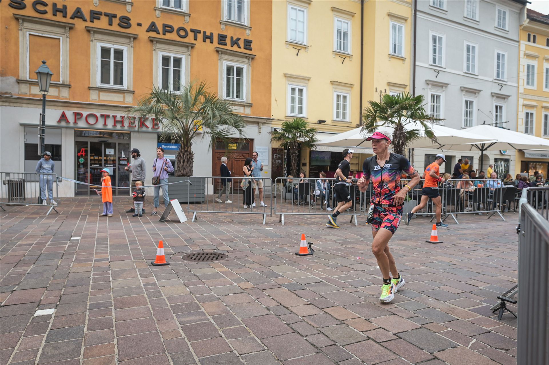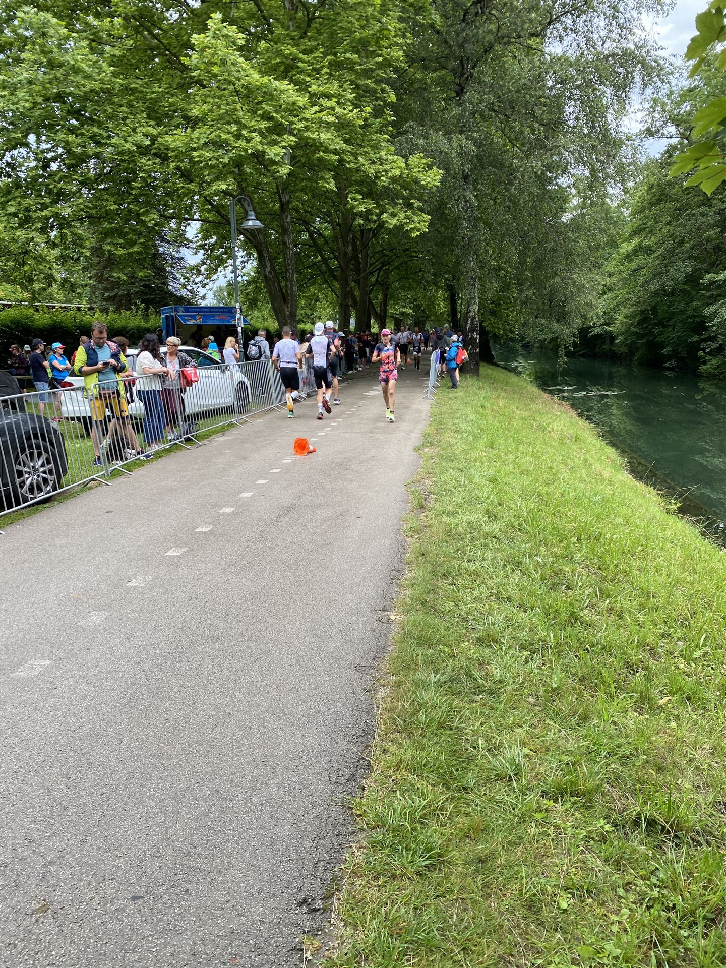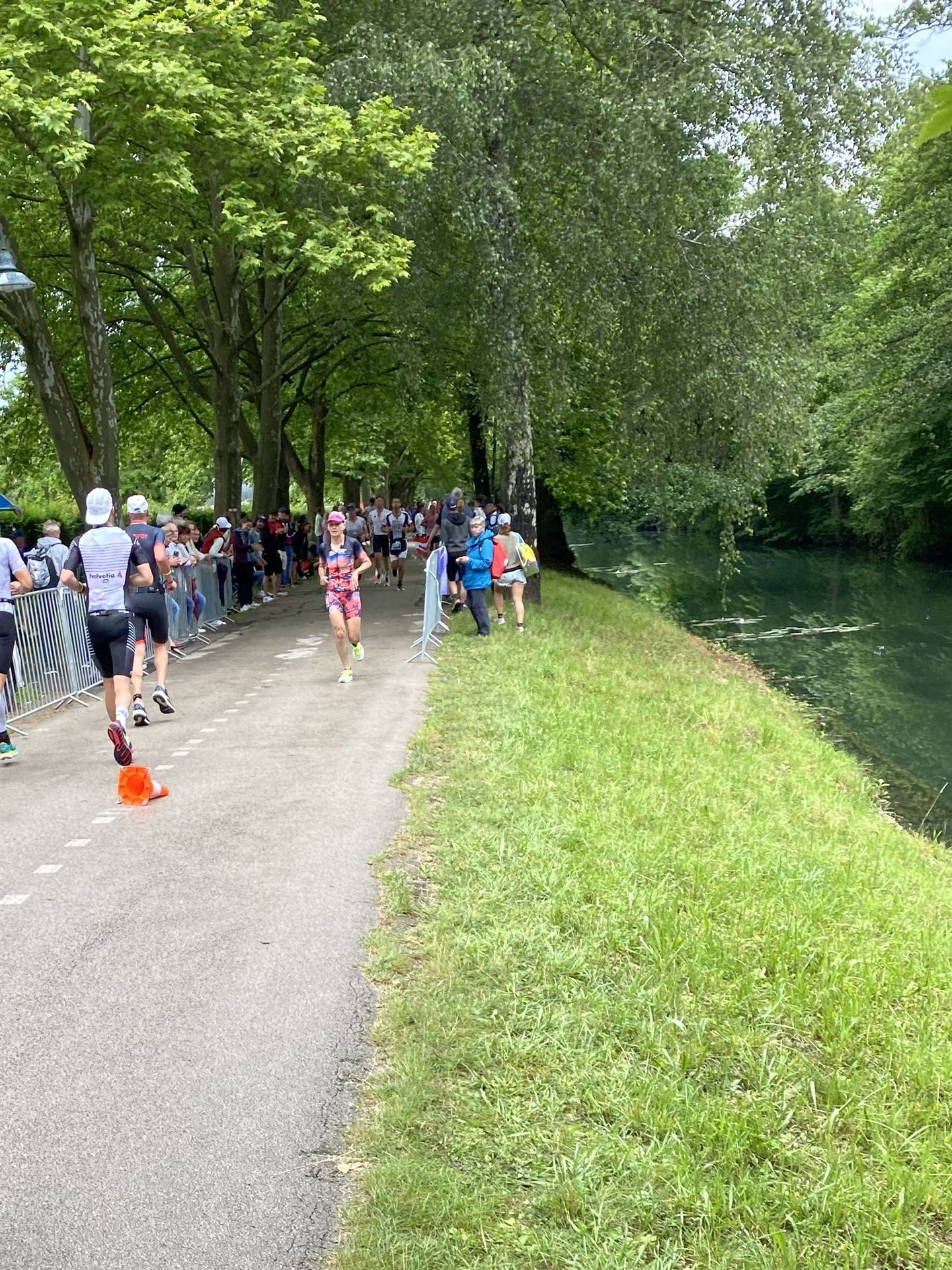 Geschwommen werden die 3,8 Kilometer im Wörthersee. Der See hat Trinkwasserqualität und ist relativ klar. Gestartet wird in Gruppen, man ordnet sich entsprechend der voraussichtlichen Schwimmzeit in eine Gruppe ein. Die Profimänner starteten um 6:30 Uhr, es gab keine Profifrauen. Ab 6:40 Uhr gingen die Agegrouper ins Wasser. Da ich keine Uhr beim Wettkampf trage konnte ich nicht einschätzen, wie lange es gedauert hat, bis ich ins Wasser konnte. Alle 5 Sekunden gingen 4 Athleten ins Wasser. Das Schwimmen war relativ entspannt, ich wurde nicht oft überholt und habe auch wenige Athleten überholt. Ich denke, die meisten Athleten haben sich korrekt eingeordnet. Der erste Streckenabschnitt klappt super, ich kann die Bojen sehr gut erkennen. Beim Rückweg in Richtung Lendkanal hatte ich leichte Schwierigkeiten mit den Bojen. War aber nicht schlimm für mich, ich habe mich an den anderen Athleten orientiert. Den Eingang zum Lendkanal konnte ich nicht erkennen, ohne Brille und dann noch direkt die Sonne, da habe mich absolut auf die anderen verlassen. Erstaunlicherweise hielt sich das Gedränge im Lendkanal auch in Grenzen, ich hatte mich Mental auf dichtes Gedränge und evtl. auch Schläge eingestellt. Nichts davon ist passiert. Das Schöne an diesem Kanal sind die Zuschauer auf beiden Seiten, die Stimmung ist super. Der Schwimmausstieg ist am Parkhotel, die Strecke bis in die Wechselzone ist relativ lang. Ich komme als 2. Frau in meiner AK aus dem Wasser. Mit meiner Schwimmzeit von 1:19:50 bin ich zufrieden.