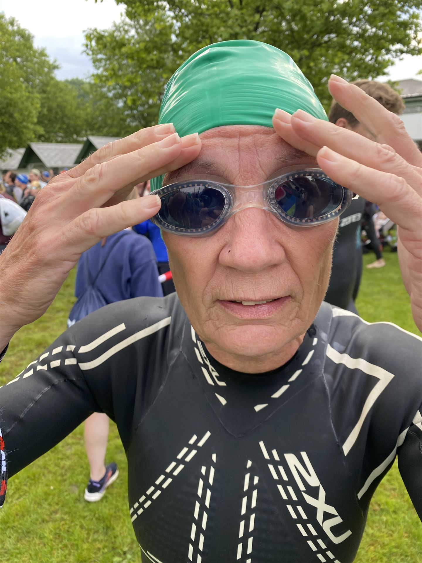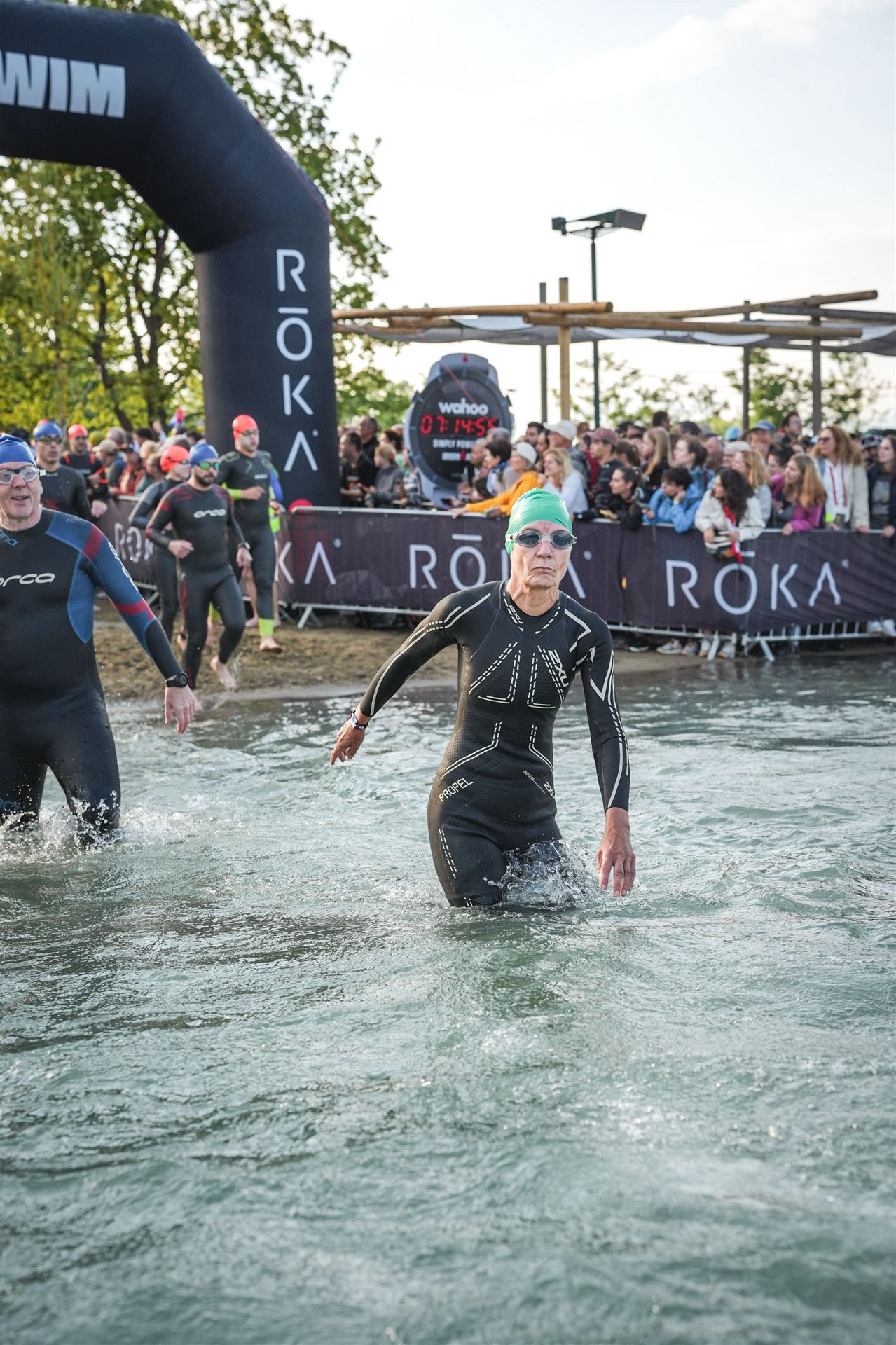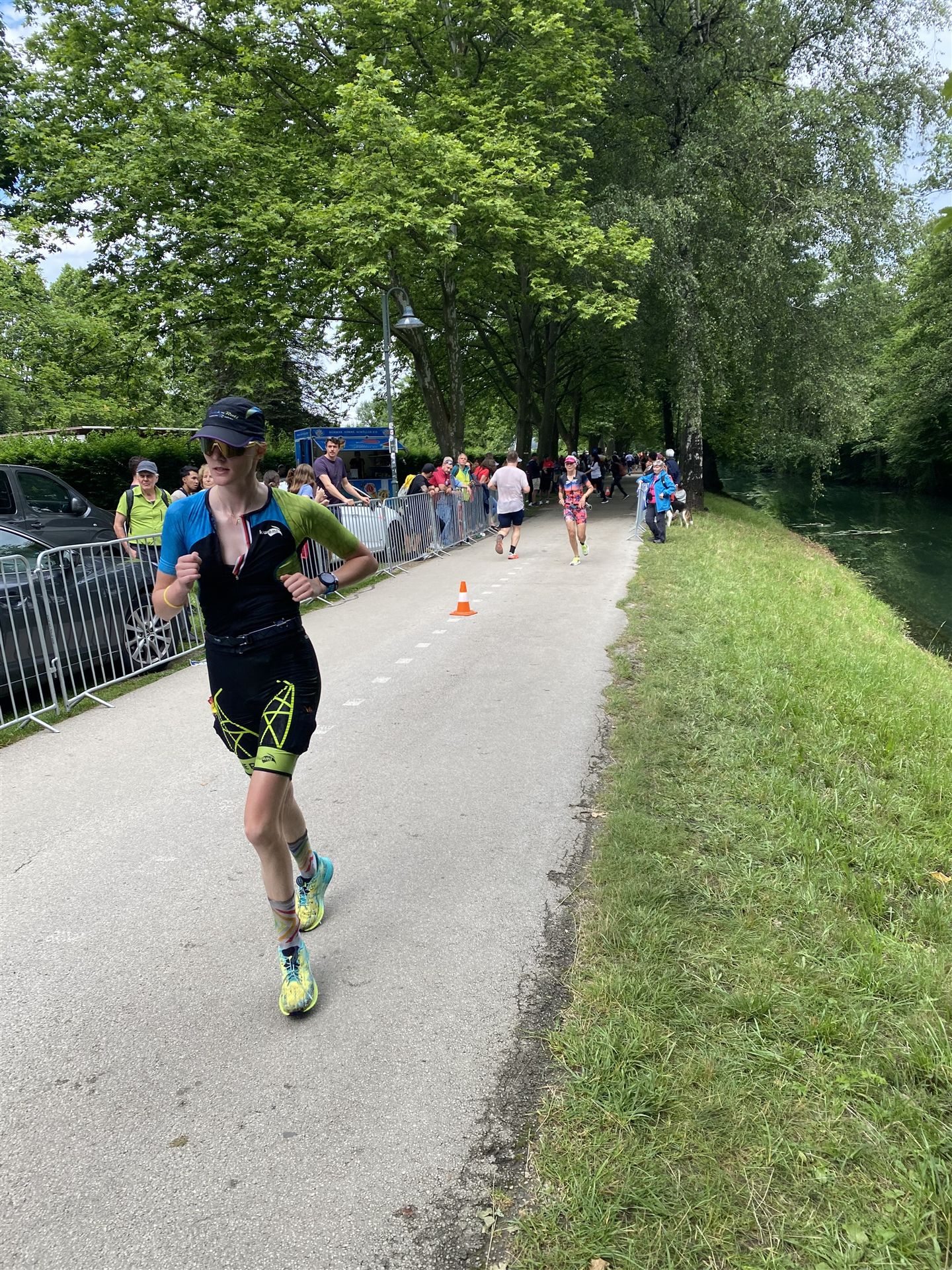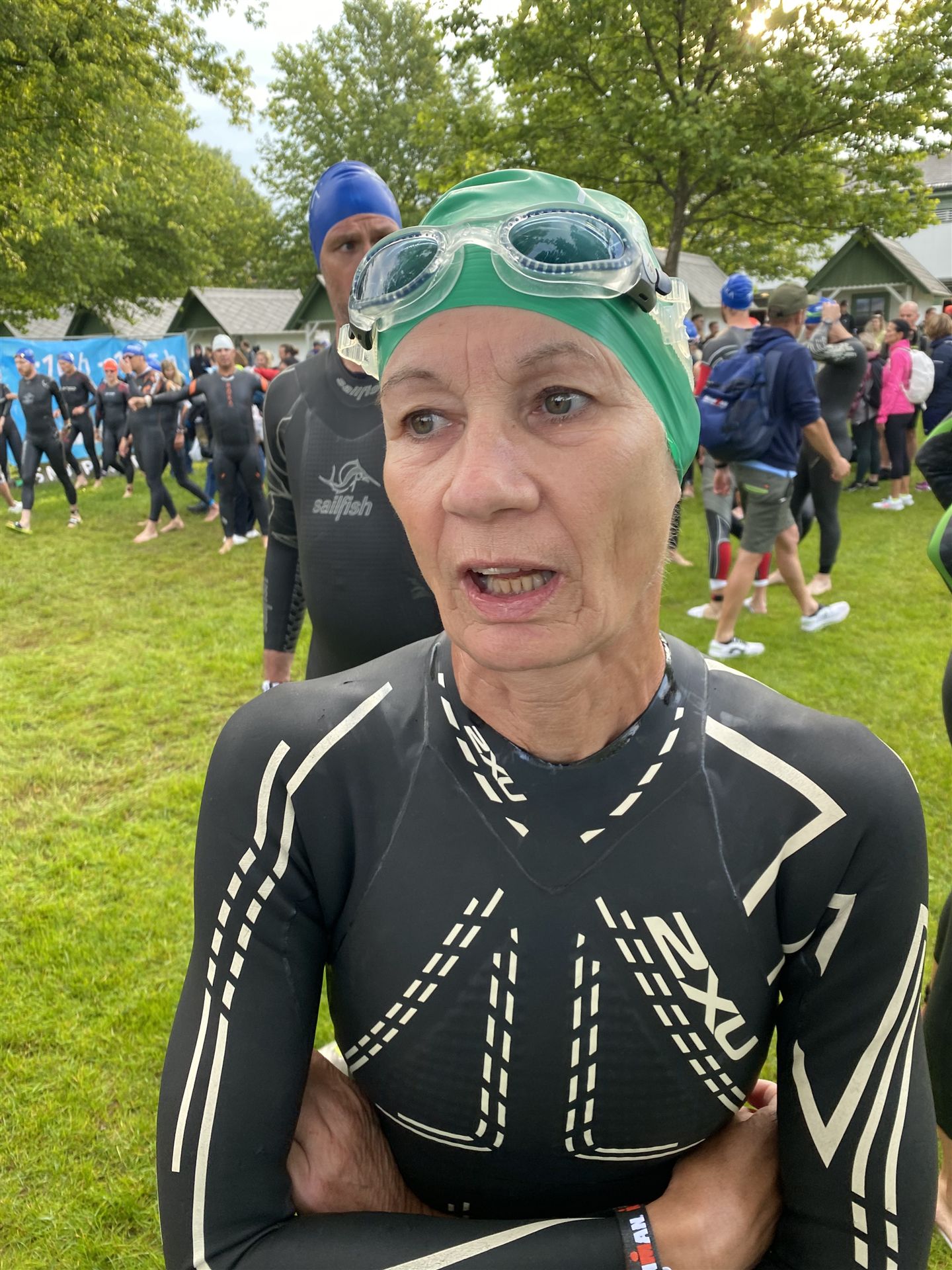 Geschwommen werden die 3,8 Kilometer im Wörthersee. Der See hat Trinkwasserqualität und ist relativ klar. Gestartet wird in Gruppen, man ordnet sich entsprechend der voraussichtlichen Schwimmzeit in eine Gruppe ein. Die Profimänner starteten um 6:30 Uhr, es gab keine Profifrauen. Ab 6:40 Uhr gingen die Agegrouper ins Wasser. Da ich keine Uhr beim Wettkampf trage konnte ich nicht einschätzen, wie lange es gedauert hat, bis ich ins Wasser konnte. Alle 5 Sekunden gingen 4 Athleten ins Wasser. Das Schwimmen war relativ entspannt, ich wurde nicht oft überholt und habe auch wenige Athleten überholt. Ich denke, die meisten Athleten haben sich korrekt eingeordnet. Der erste Streckenabschnitt klappt super, ich kann die Bojen sehr gut erkennen. Beim Rückweg in Richtung Lendkanal hatte ich leichte Schwierigkeiten mit den Bojen. War aber nicht schlimm für mich, ich habe mich an den anderen Athleten orientiert. Den Eingang zum Lendkanal konnte ich nicht erkennen, ohne Brille und dann noch direkt die Sonne, da habe mich absolut auf die anderen verlassen. Erstaunlicherweise hielt sich das Gedränge im Lendkanal auch in Grenzen, ich hatte mich Mental auf dichtes Gedränge und evtl. auch Schläge eingestellt. Nichts davon ist passiert. Das Schöne an diesem Kanal sind die Zuschauer auf beiden Seiten, die Stimmung ist super. Der Schwimmausstieg ist am Parkhotel, die Strecke bis in die Wechselzone ist relativ lang. Ich komme als 2. Frau in meiner AK aus dem Wasser. Mit meiner Schwimmzeit von 1:19:50 bin ich zufrieden.