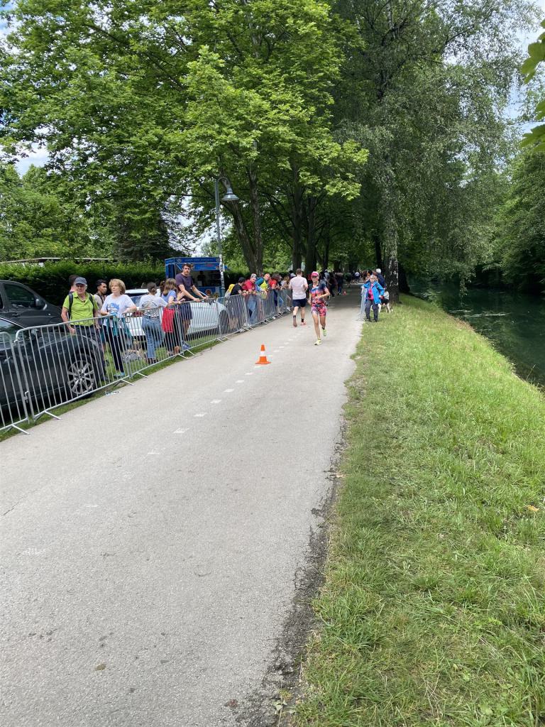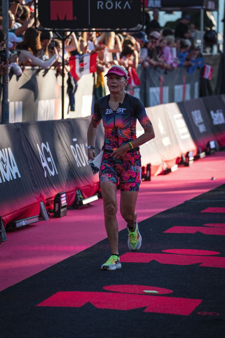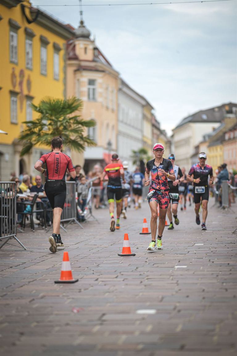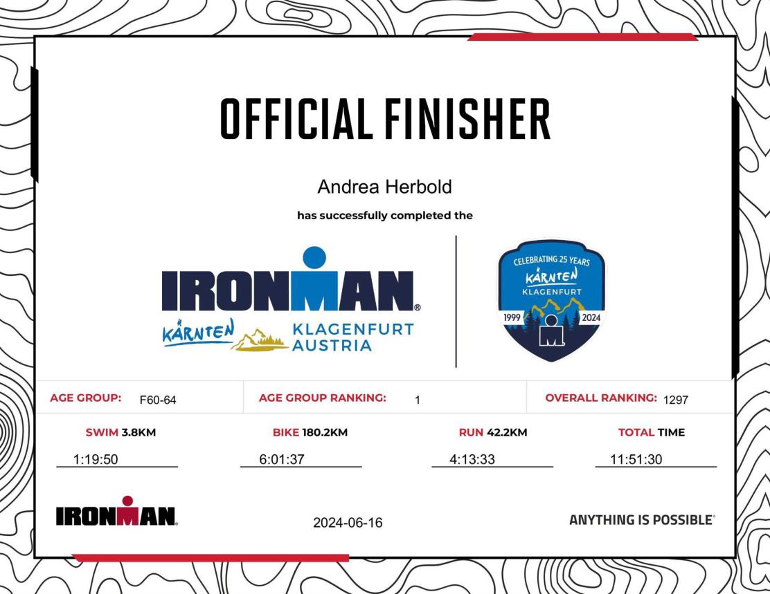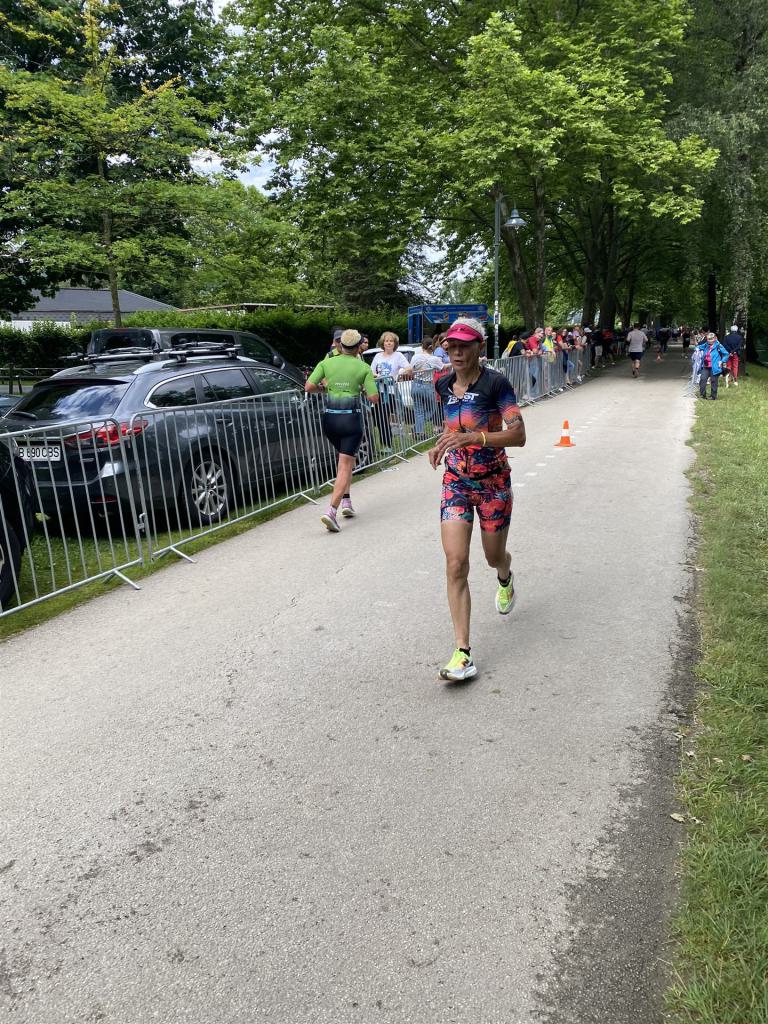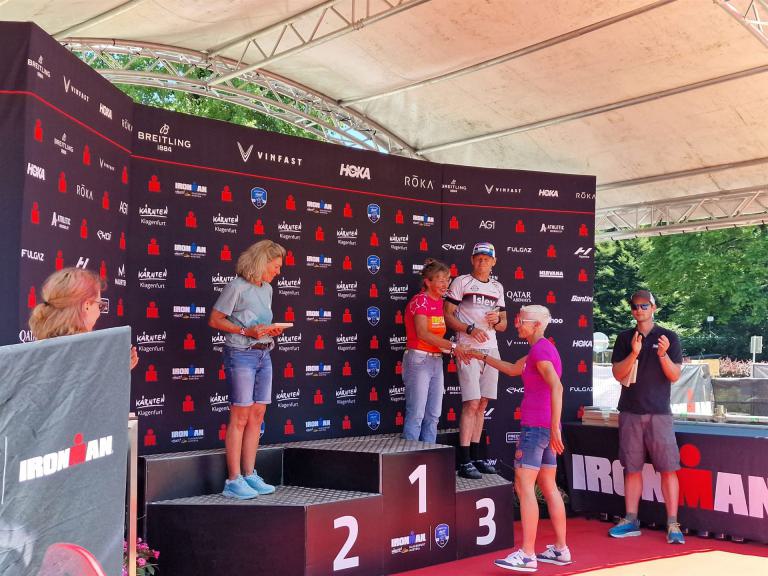 Ab in die Wechselzone und die Radschuhe mit den Laufschuhen tauschen. Aufgrund der Temperatur entscheide ich mich, mein Trikot anzulassen. Ich gehe als erste Frau in meiner AK mit einem Vorsprung von circa 18 Minuten auf die Laufstrecke. Nach dem ersten Kilometer geht es mir nicht so gut, ich fühle mich schlapp. Das kenne ich überhaupt nicht von mir. Anscheinend habe ich auf dem Rad nicht ausreichend gegessen. Normalerweise kann ich nach dem Rad direkt ohne Probleme los laufen, dieses Mal habe ich Probleme. Ich entscheide mich bis zur ersten Verpflegungsstelle Gehpausen einzulegen. An der ersten Verpflegungsstelle bin ich vorbei gelaufen, keine Ahnung weshalb. Das ist Wettkampf, da passieren solche Dingen. Bei der 2. Verpflegungsstelle nehme ich mir etwas Zeit und esse und trinke ordentlich. Danach geht es mir viel besser. Nach den ersten 10 Kilometern konnte ich meinen Vorsprung auf die Zweite bereits etwas ausbauen. Ich halte bei jeder Verpflegungsstelle an und nehme Flüssigkeit bzw. Gel zu mir. Der Vorsprung wird immer größer. Werner hält mich auf dem Laufenden. Ab circa Kilometer 32 habe ich Probleme mit der Verpflegung. Ich kann nichts mehr aufnehmen, mein Magen rebelliert. Ich entscheide spontan, dass ich es mit Cola probiere. Die Strategie geht auf, mein Magen rebelliert nicht mehr. Da ich bereits einen Vorsprung von über 45 Minuten auf den letzten 10 Kilometern habe gehe ich auf Nummer sicher. Ich nehme nur noch Cola zu mir und lege die ein- oder andere Gehpause ein. Ich bin zuversichtlich als Erste ins Ziel zu kommen. Bei Kilometer 39 bin ich schon leicht euphorisch, laufe jedoch weiter verhalten. Kein unnötiges Risiko eingehen. Bei Kilometer 41 fange ich an innerlich zu jubeln. Auf dem letzten Kilometer sind alle Probleme vergessen, es geht in Richtung Ziel. Der Zieleinlauf ist für jeden Athleten etwas Besonderes. Direkt im Ziel wartet bereits Werner auf mich und überreicht mir die Finisher Medaille. Das ist ein toller Moment. Natürlich habe ich, wie immer, vergessen auf meine Endzeit zu schauen. Wichtig für mich ist, ins Ziel zu kommen. Natürlich freut man sich, wenn dann noch eine gute Zeit bzw. Platzierung raus komm. Den Marathon bin ich in einer Zeit von 4:13:33 gelaufen. Meine Gesamtzeit beträgt 11:51:30 Stunden. Wahnsinn, ich bin total begeistert mit dieser Zeit gefinisht zu haben. Die Zweite in meiner AK kommt erst 1:17 Stunden nach mir ins Ziel. Es ist toll wieviel Zeit ich noch rauslaufen konnte. Es war wieder ein tolles Erlebnis in Klagenfurt und ich bin dankbar bei diesem Jubiläum dabei sein zu können. Nach dem Wettkampf gibt es noch eine Woche Urlaub und Erholung, danach geht der Focus auf die Weltmeisterschaft in Nizza.