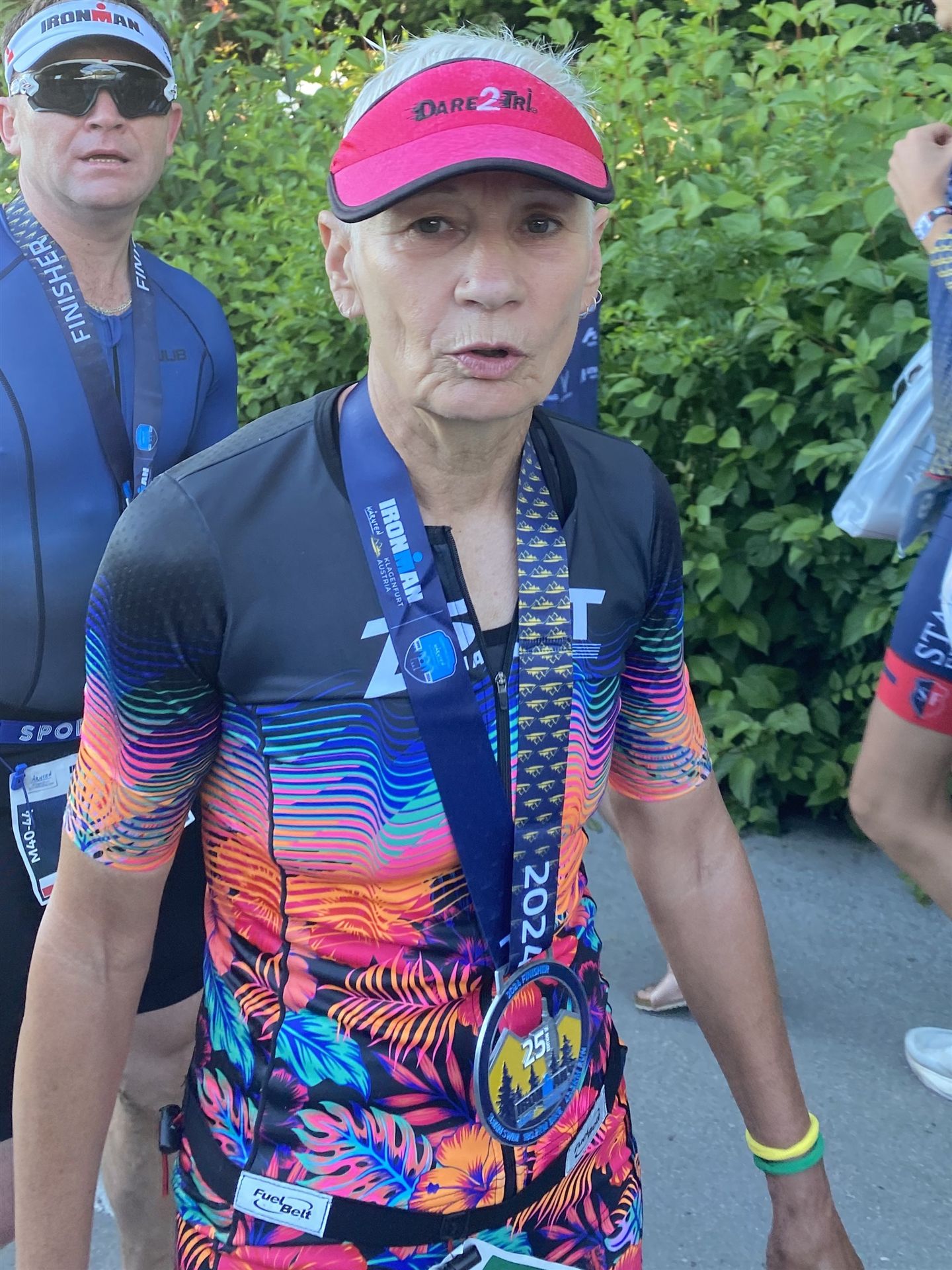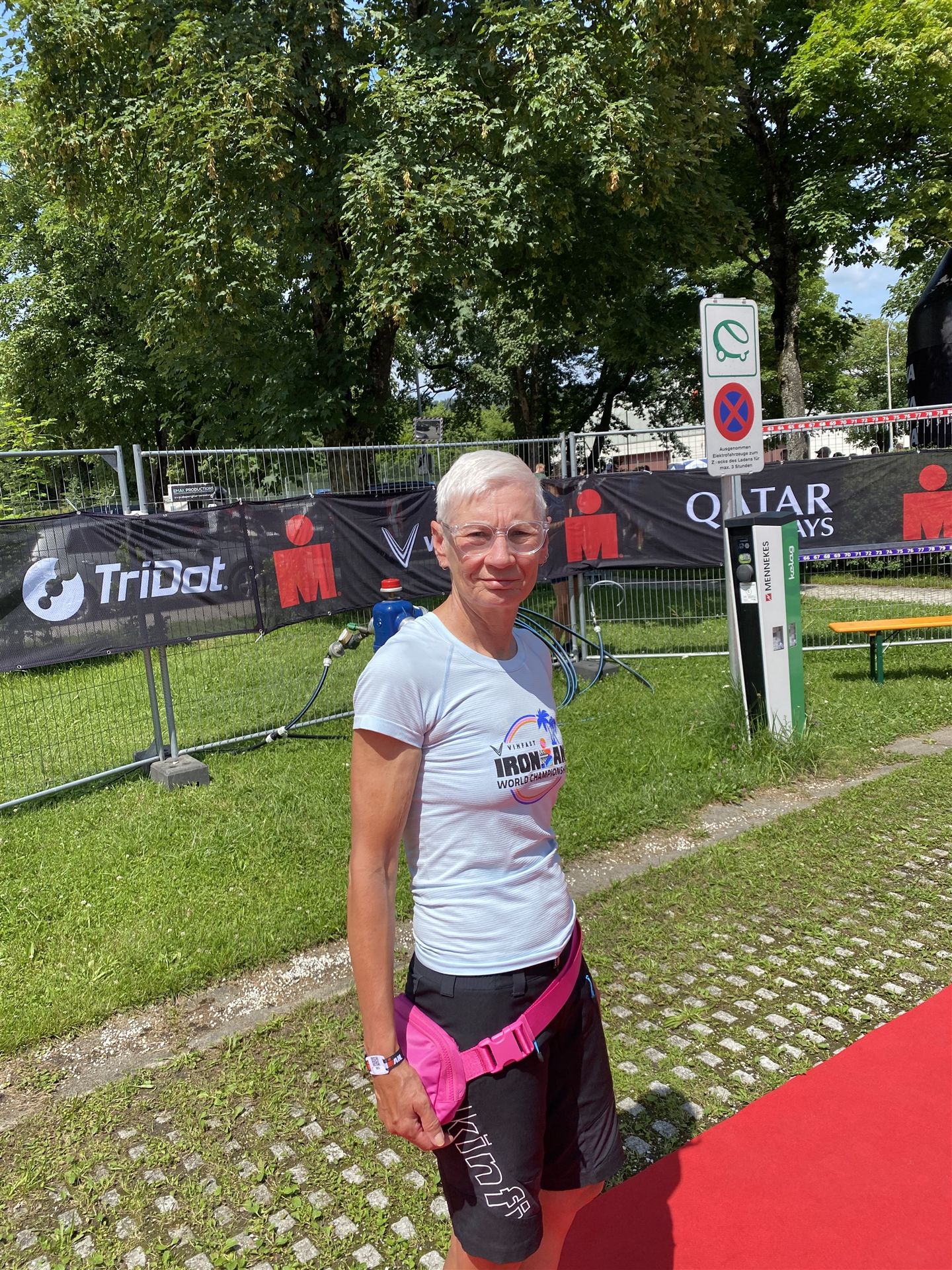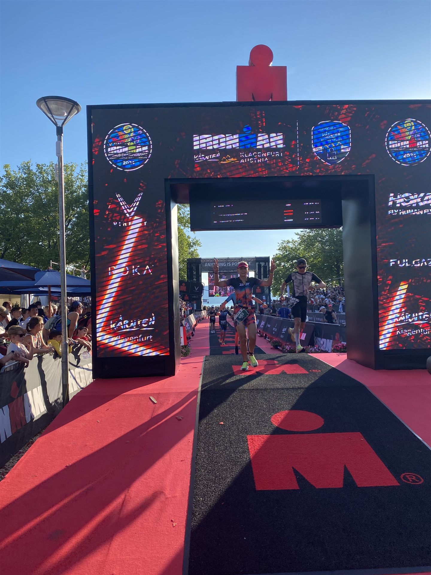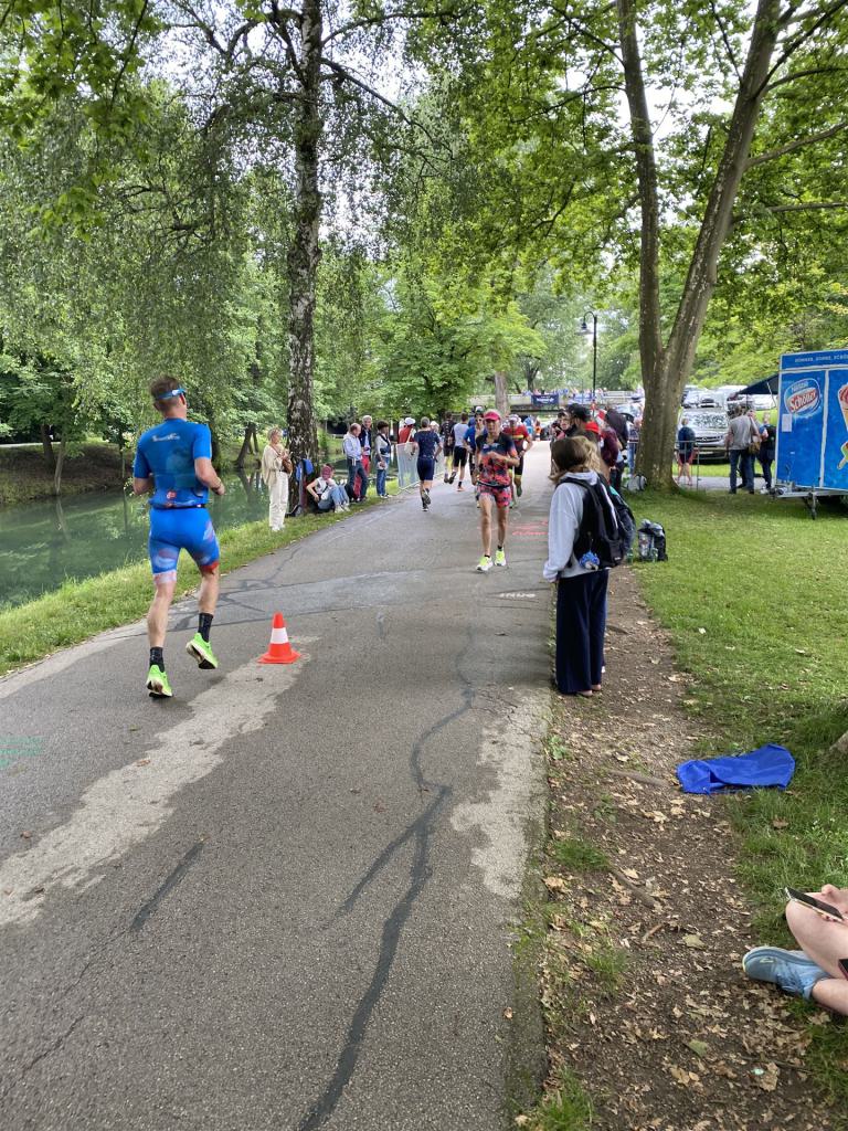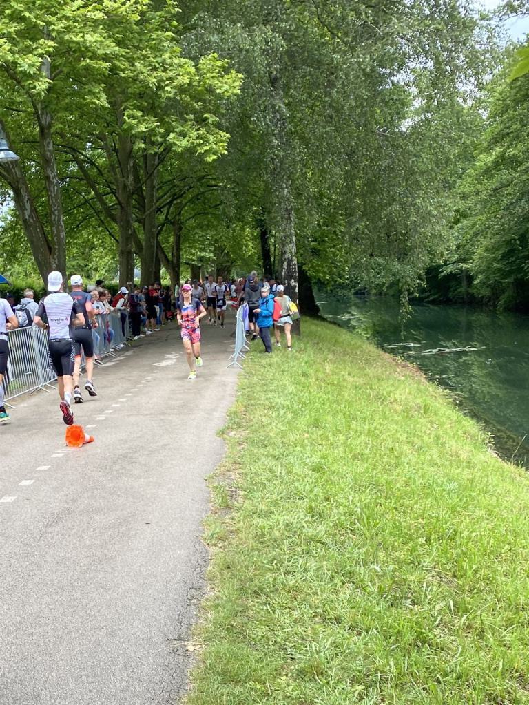 Ab in die Wechselzone und die Radschuhe mit den Laufschuhen tauschen. Aufgrund der Temperatur entscheide ich mich, mein Trikot anzulassen. Ich gehe als erste Frau in meiner AK mit einem Vorsprung von circa 18 Minuten auf die Laufstrecke. Nach dem ersten Kilometer geht es mir nicht so gut, ich fühle mich schlapp. Das kenne ich überhaupt nicht von mir. Anscheinend habe ich auf dem Rad nicht ausreichend gegessen. Normalerweise kann ich nach dem Rad direkt ohne Probleme los laufen, dieses Mal habe ich Probleme. Ich entscheide mich bis zur ersten Verpflegungsstelle Gehpausen einzulegen. An der ersten Verpflegungsstelle bin ich vorbei gelaufen, keine Ahnung weshalb. Das ist Wettkampf, da passieren solche Dingen. Bei der 2. Verpflegungsstelle nehme ich mir etwas Zeit und esse und trinke ordentlich. Danach geht es mir viel besser. Nach den ersten 10 Kilometern konnte ich meinen Vorsprung auf die Zweite bereits etwas ausbauen. Ich halte bei jeder Verpflegungsstelle an und nehme Flüssigkeit bzw. Gel zu mir. Der Vorsprung wird immer größer. Werner hält mich auf dem Laufenden. Ab circa Kilometer 32 habe ich Probleme mit der Verpflegung. Ich kann nichts mehr aufnehmen, mein Magen rebelliert. Ich entscheide spontan, dass ich es mit Cola probiere. Die Strategie geht auf, mein Magen rebelliert nicht mehr. Da ich bereits einen Vorsprung von über 45 Minuten auf den letzten 10 Kilometern habe gehe ich auf Nummer sicher. Ich nehme nur noch Cola zu mir und lege die ein- oder andere Gehpause ein. Ich bin zuversichtlich als Erste ins Ziel zu kommen. Bei Kilometer 39 bin ich schon leicht euphorisch, laufe jedoch weiter verhalten. Kein unnötiges Risiko eingehen. Bei Kilometer 41 fange ich an innerlich zu jubeln. Auf dem letzten Kilometer sind alle Probleme vergessen, es geht in Richtung Ziel. Der Zieleinlauf ist für jeden Athleten etwas Besonderes. Direkt im Ziel wartet bereits Werner auf mich und überreicht mir die Finisher Medaille. Das ist ein toller Moment. Natürlich habe ich, wie immer, vergessen auf meine Endzeit zu schauen. Wichtig für mich ist, ins Ziel zu kommen. Natürlich freut man sich, wenn dann noch eine gute Zeit bzw. Platzierung raus komm. Den Marathon bin ich in einer Zeit von 4:13:33 gelaufen. Meine Gesamtzeit beträgt 11:51:30 Stunden. Wahnsinn, ich bin total begeistert mit dieser Zeit gefinisht zu haben. Die Zweite in meiner AK kommt erst 1:17 Stunden nach mir ins Ziel. Es ist toll wieviel Zeit ich noch rauslaufen konnte. Es war wieder ein tolles Erlebnis in Klagenfurt und ich bin dankbar bei diesem Jubiläum dabei sein zu können. Nach dem Wettkampf gibt es noch eine Woche Urlaub und Erholung, danach geht der Focus auf die Weltmeisterschaft in Nizza.