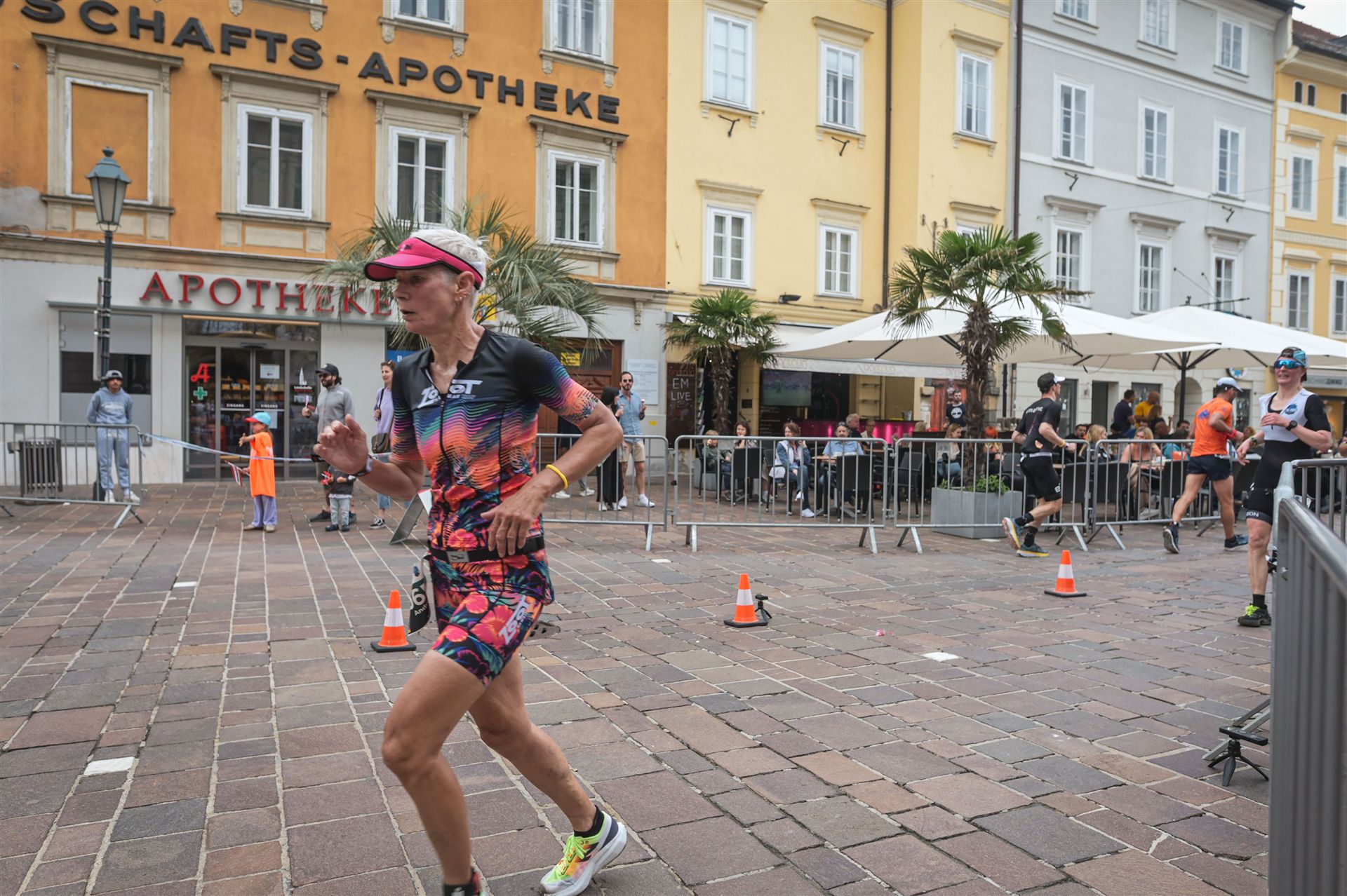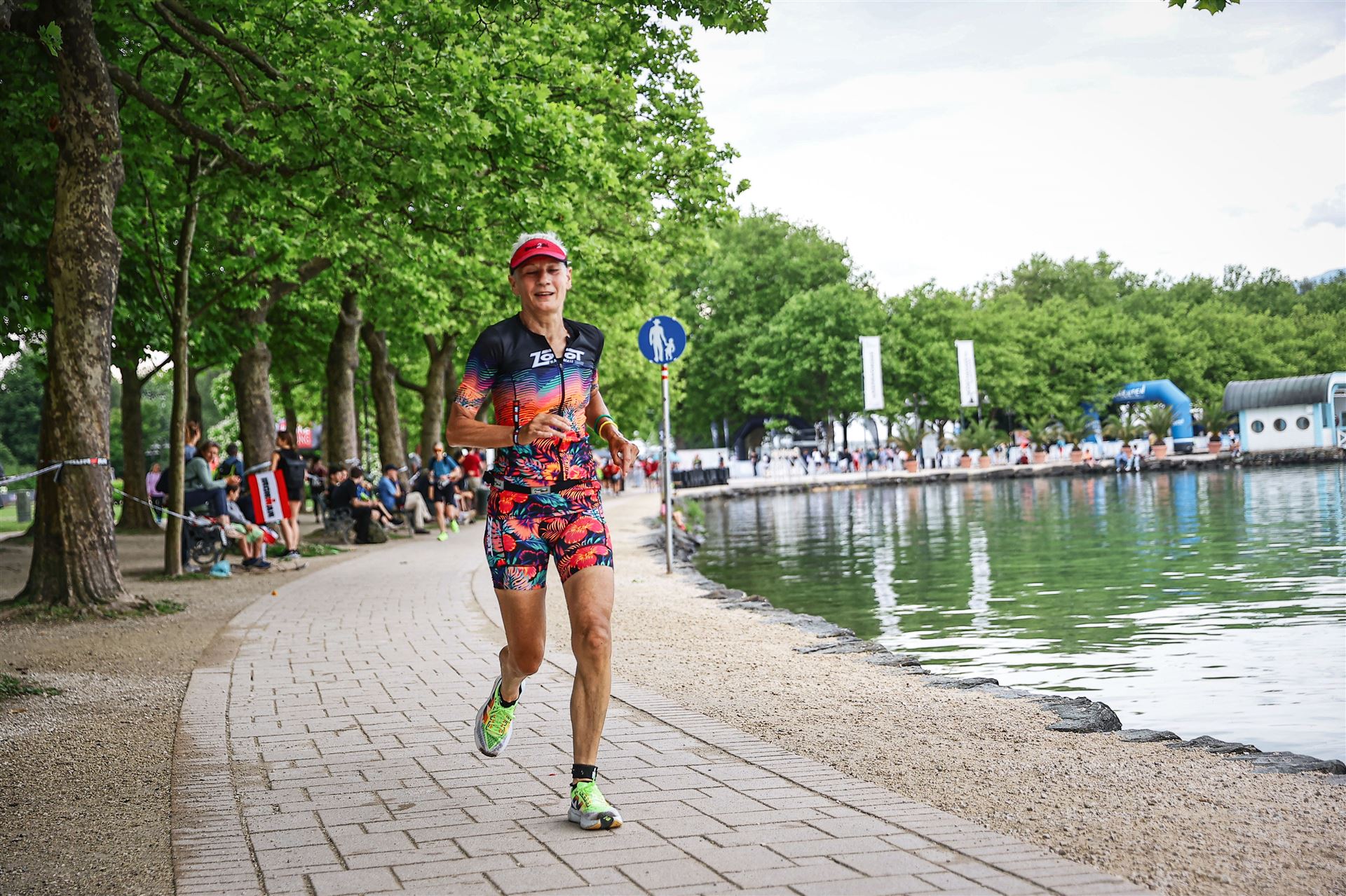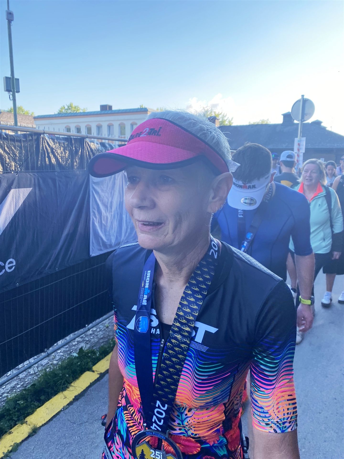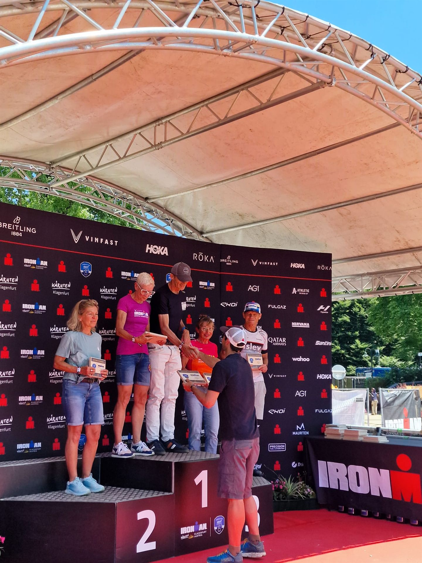 Ab in die Wechselzone und die Radschuhe mit den Laufschuhen tauschen. Aufgrund der Temperatur entscheide ich mich, mein Trikot anzulassen. Ich gehe als erste Frau in meiner AK mit einem Vorsprung von circa 18 Minuten auf die Laufstrecke. Nach dem ersten Kilometer geht es mir nicht so gut, ich fühle mich schlapp. Das kenne ich überhaupt nicht von mir. Anscheinend habe ich auf dem Rad nicht ausreichend gegessen. Normalerweise kann ich nach dem Rad direkt ohne Probleme los laufen, dieses Mal habe ich Probleme. Ich entscheide mich bis zur ersten Verpflegungsstelle Gehpausen einzulegen. An der ersten Verpflegungsstelle bin ich vorbei gelaufen, keine Ahnung weshalb. Das ist Wettkampf, da passieren solche Dingen. Bei der 2. Verpflegungsstelle nehme ich mir etwas Zeit und esse und trinke ordentlich. Danach geht es mir viel besser. Nach den ersten 10 Kilometern konnte ich meinen Vorsprung auf die Zweite bereits etwas ausbauen. Ich halte bei jeder Verpflegungsstelle an und nehme Flüssigkeit bzw. Gel zu mir. Der Vorsprung wird immer größer. Werner hält mich auf dem Laufenden. Ab circa Kilometer 32 habe ich Probleme mit der Verpflegung. Ich kann nichts mehr aufnehmen, mein Magen rebelliert. Ich entscheide spontan, dass ich es mit Cola probiere. Die Strategie geht auf, mein Magen rebelliert nicht mehr. Da ich bereits einen Vorsprung von über 45 Minuten auf den letzten 10 Kilometern habe gehe ich auf Nummer sicher. Ich nehme nur noch Cola zu mir und lege die ein- oder andere Gehpause ein. Ich bin zuversichtlich als Erste ins Ziel zu kommen. Bei Kilometer 39 bin ich schon leicht euphorisch, laufe jedoch weiter verhalten. Kein unnötiges Risiko eingehen. Bei Kilometer 41 fange ich an innerlich zu jubeln. Auf dem letzten Kilometer sind alle Probleme vergessen, es geht in Richtung Ziel. Der Zieleinlauf ist für jeden Athleten etwas Besonderes. Direkt im Ziel wartet bereits Werner auf mich und überreicht mir die Finisher Medaille. Das ist ein toller Moment. Natürlich habe ich, wie immer, vergessen auf meine Endzeit zu schauen. Wichtig für mich ist, ins Ziel zu kommen. Natürlich freut man sich, wenn dann noch eine gute Zeit bzw. Platzierung raus komm. Den Marathon bin ich in einer Zeit von 4:13:33 gelaufen. Meine Gesamtzeit beträgt 11:51:30 Stunden. Wahnsinn, ich bin total begeistert mit dieser Zeit gefinisht zu haben. Die Zweite in meiner AK kommt erst 1:17 Stunden nach mir ins Ziel. Es ist toll wieviel Zeit ich noch rauslaufen konnte. Es war wieder ein tolles Erlebnis in Klagenfurt und ich bin dankbar bei diesem Jubiläum dabei sein zu können. Nach dem Wettkampf gibt es noch eine Woche Urlaub und Erholung, danach geht der Focus auf die Weltmeisterschaft in Nizza.