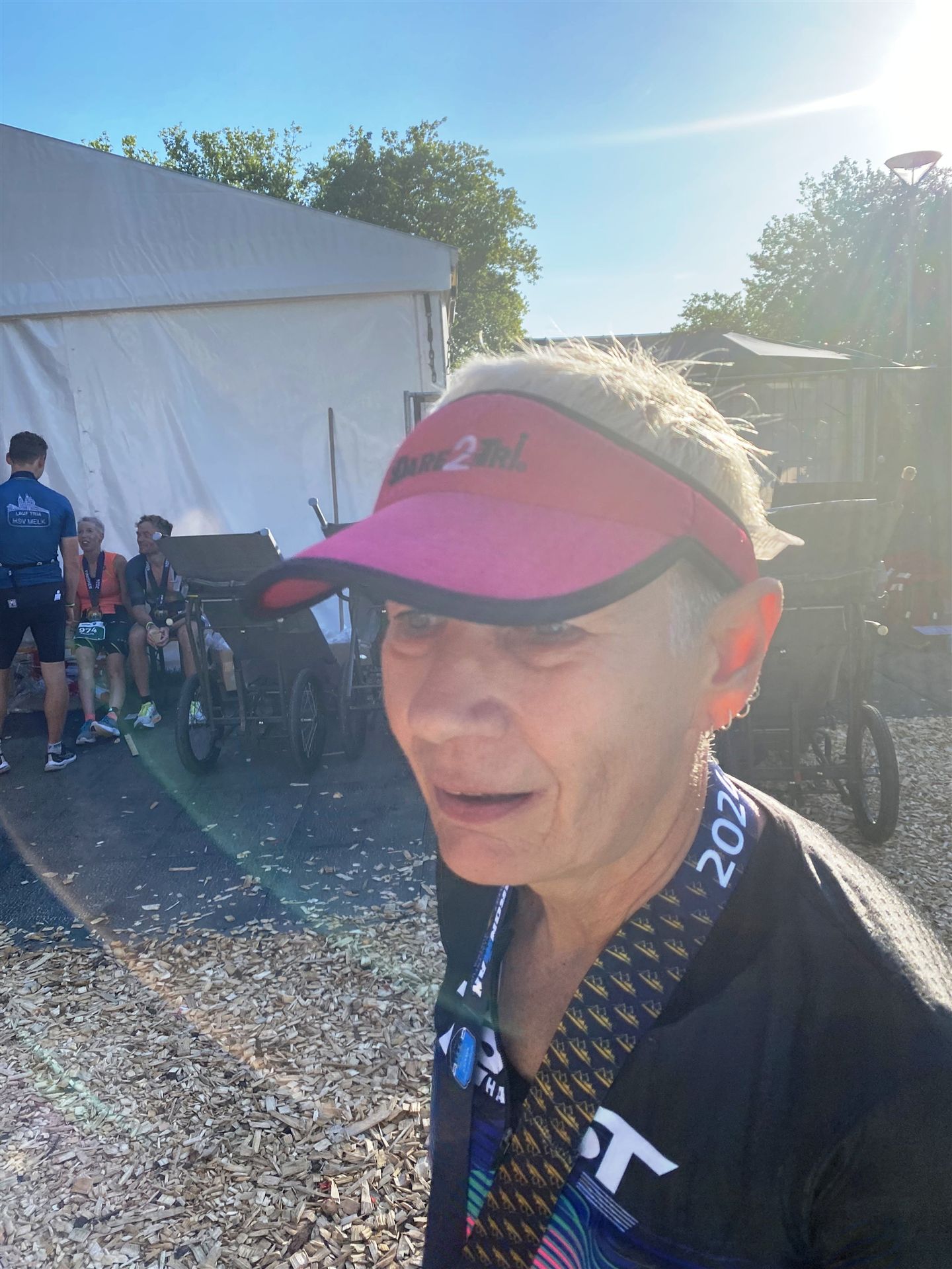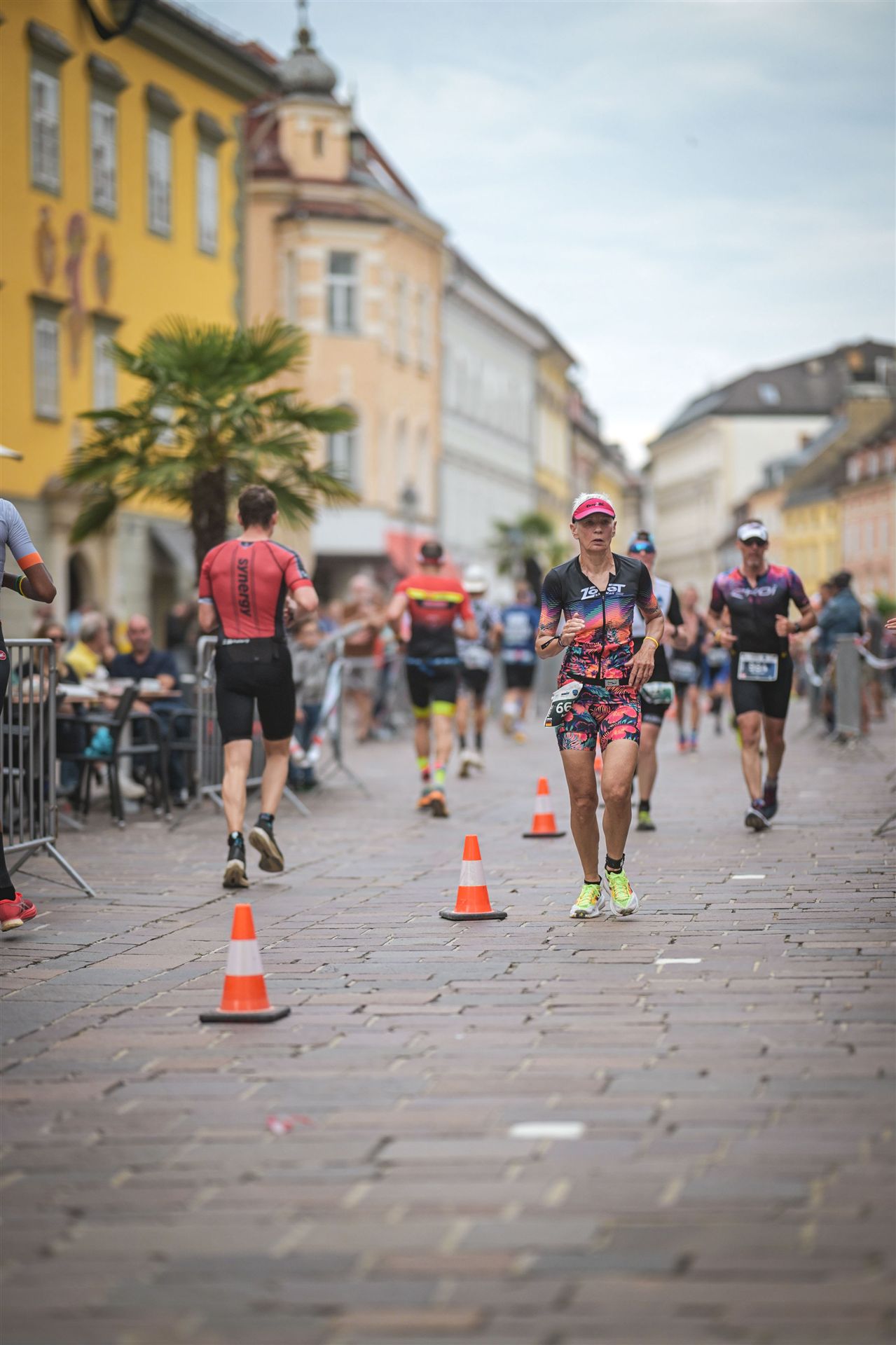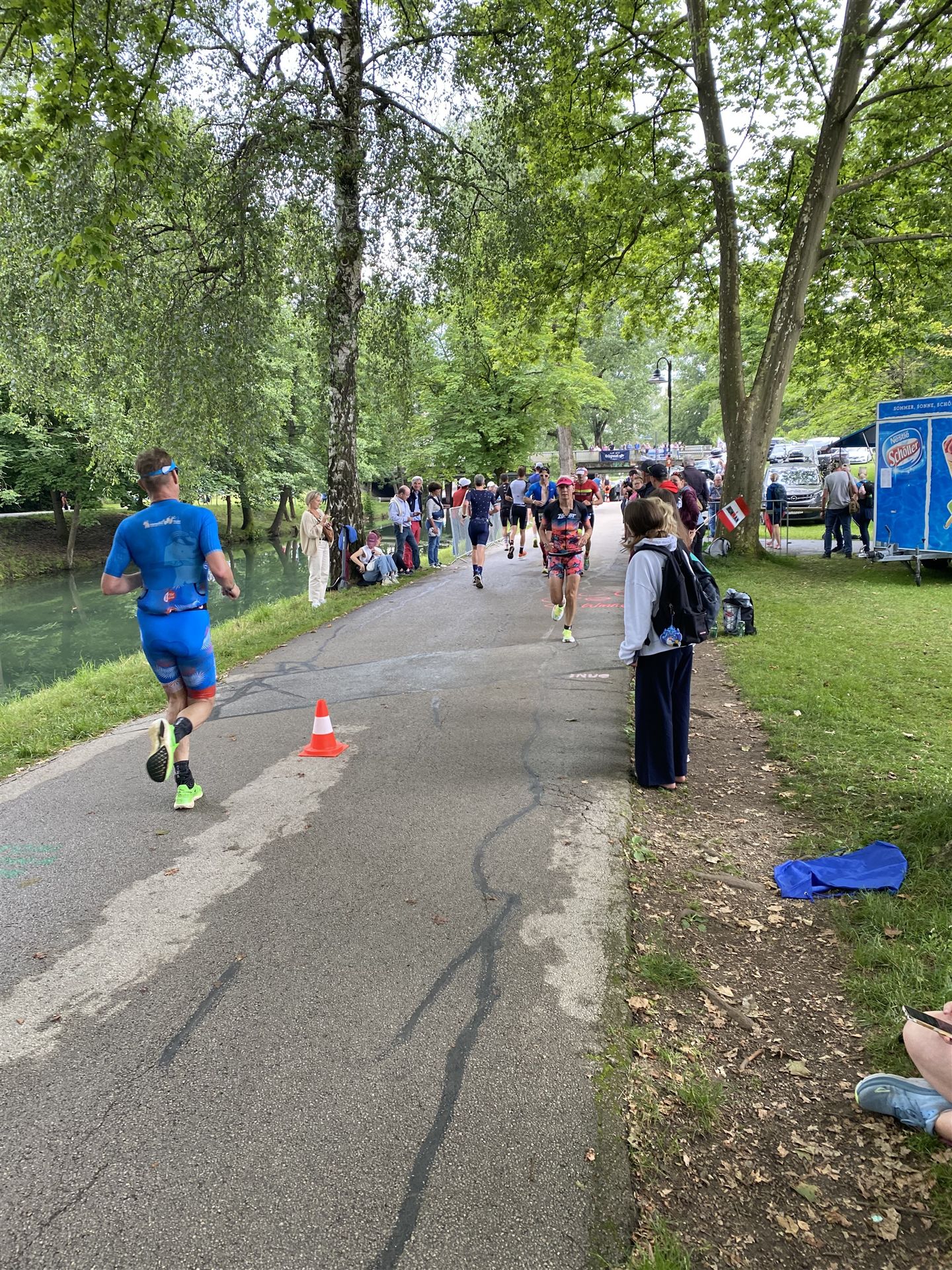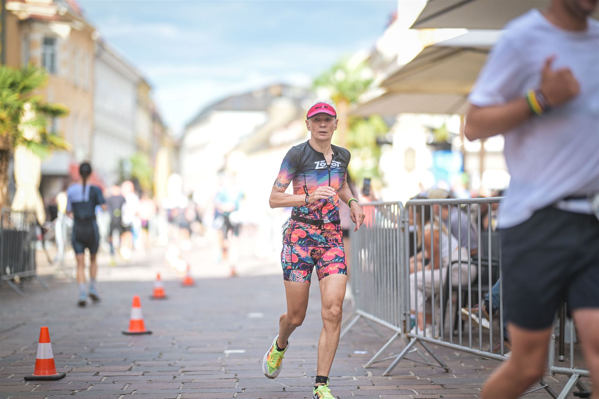 Ab in die Wechselzone und die Radschuhe mit den Laufschuhen tauschen. Aufgrund der Temperatur entscheide ich mich, mein Trikot anzulassen. Ich gehe als erste Frau in meiner AK mit einem Vorsprung von circa 18 Minuten auf die Laufstrecke. Nach dem ersten Kilometer geht es mir nicht so gut, ich fühle mich schlapp. Das kenne ich überhaupt nicht von mir. Anscheinend habe ich auf dem Rad nicht ausreichend gegessen. Normalerweise kann ich nach dem Rad direkt ohne Probleme los laufen, dieses Mal habe ich Probleme. Ich entscheide mich bis zur ersten Verpflegungsstelle Gehpausen einzulegen. An der ersten Verpflegungsstelle bin ich vorbei gelaufen, keine Ahnung weshalb. Das ist Wettkampf, da passieren solche Dingen. Bei der 2. Verpflegungsstelle nehme ich mir etwas Zeit und esse und trinke ordentlich. Danach geht es mir viel besser. Nach den ersten 10 Kilometern konnte ich meinen Vorsprung auf die Zweite bereits etwas ausbauen. Ich halte bei jeder Verpflegungsstelle an und nehme Flüssigkeit bzw. Gel zu mir. Der Vorsprung wird immer größer. Werner hält mich auf dem Laufenden. Ab circa Kilometer 32 habe ich Probleme mit der Verpflegung. Ich kann nichts mehr aufnehmen, mein Magen rebelliert. Ich entscheide spontan, dass ich es mit Cola probiere. Die Strategie geht auf, mein Magen rebelliert nicht mehr. Da ich bereits einen Vorsprung von über 45 Minuten auf den letzten 10 Kilometern habe gehe ich auf Nummer sicher. Ich nehme nur noch Cola zu mir und lege die ein- oder andere Gehpause ein. Ich bin zuversichtlich als Erste ins Ziel zu kommen. Bei Kilometer 39 bin ich schon leicht euphorisch, laufe jedoch weiter verhalten. Kein unnötiges Risiko eingehen. Bei Kilometer 41 fange ich an innerlich zu jubeln. Auf dem letzten Kilometer sind alle Probleme vergessen, es geht in Richtung Ziel. Der Zieleinlauf ist für jeden Athleten etwas Besonderes. Direkt im Ziel wartet bereits Werner auf mich und überreicht mir die Finisher Medaille. Das ist ein toller Moment. Natürlich habe ich, wie immer, vergessen auf meine Endzeit zu schauen. Wichtig für mich ist, ins Ziel zu kommen. Natürlich freut man sich, wenn dann noch eine gute Zeit bzw. Platzierung raus komm. Den Marathon bin ich in einer Zeit von 4:13:33 gelaufen. Meine Gesamtzeit beträgt 11:51:30 Stunden. Wahnsinn, ich bin total begeistert mit dieser Zeit gefinisht zu haben. Die Zweite in meiner AK kommt erst 1:17 Stunden nach mir ins Ziel. Es ist toll wieviel Zeit ich noch rauslaufen konnte. Es war wieder ein tolles Erlebnis in Klagenfurt und ich bin dankbar bei diesem Jubiläum dabei sein zu können. Nach dem Wettkampf gibt es noch eine Woche Urlaub und Erholung, danach geht der Focus auf die Weltmeisterschaft in Nizza.