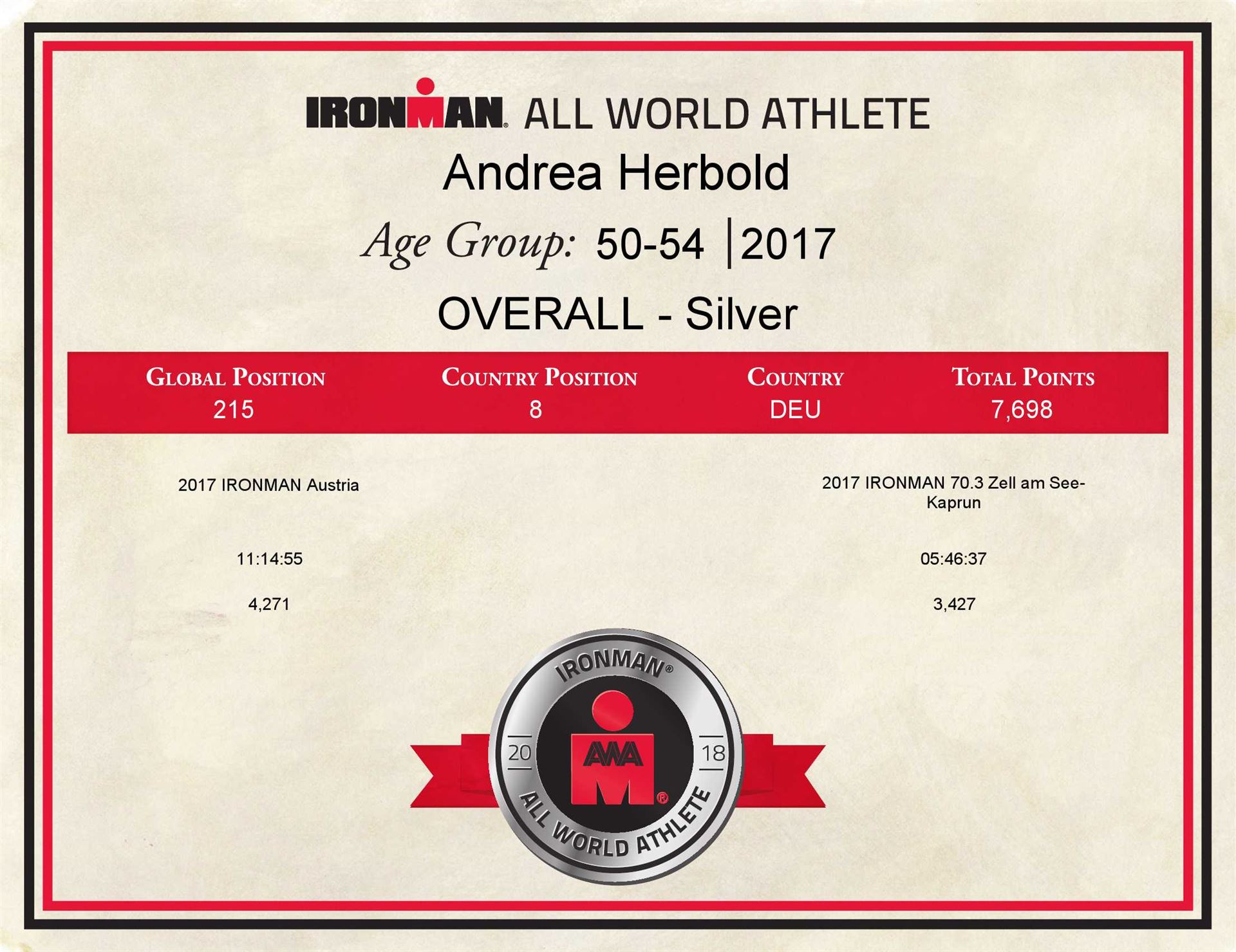 2017 IRONMAN Age Group Ranking AWA